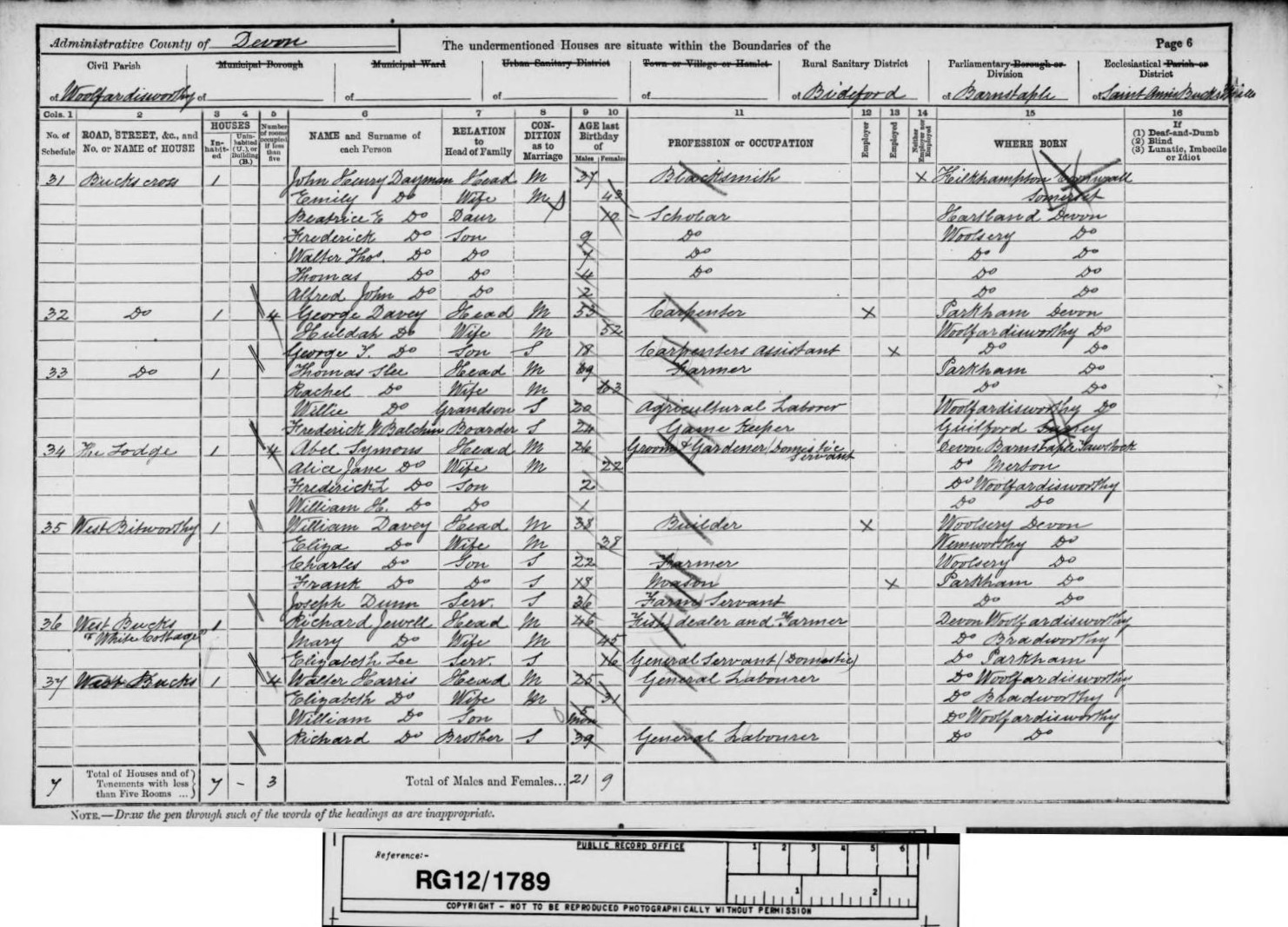 11. He appeared on the 1891 British census on 5 April 1891 in Woolfardisworthy, , Devonshire, England. 197 Registration District No. : 287, Enumeration Dist. No. 5, Folio 52, Page 6, Sched. 32 12. He worked as a Carpenter(Em'er) on 5 April 1891 in Woolfardisworthy, , Devonshire, England. 198 13. He resided at Bucks Cross on 5 April 1891 in Woolfardisworthy, , Devonshire, England. 198 This event was shared with George Thomas DAVEY (1872-1943) and Huldah CORY (1839-1910).