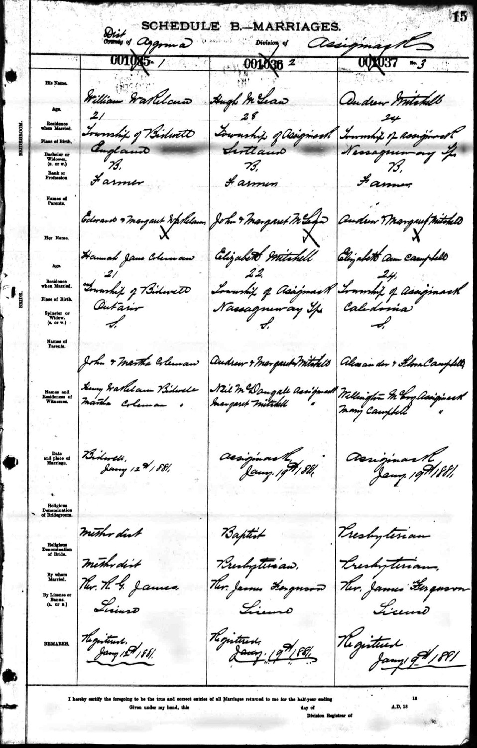 1. Marriage Record: 19 January 1881, Assiginack Township, Manitoulin, Ontario, Canada. This marriage appears on the same page as that of Elizabeth's brother, Andrew Mitchell's marriage to Elizabeth Campbell. Marriage Notes: