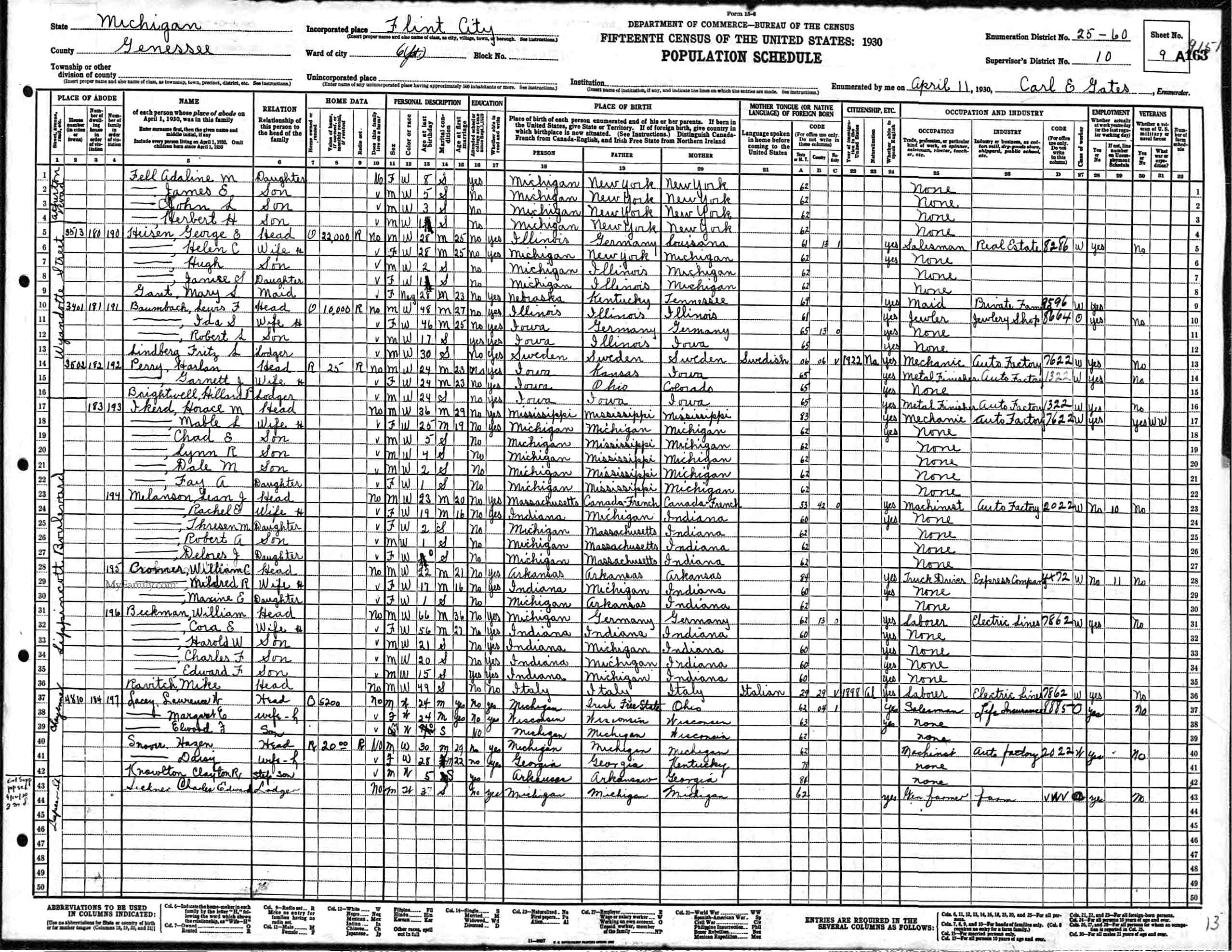 6. He resided at 4810 Cheyenne Street on 11 April 1930 in Flint, Genesee, Michigan, United States. 51 This event was shared with Edward Thomas LACEY (1929-2021) and Margaret Elizabeth ABBOTT (1905-1994).
