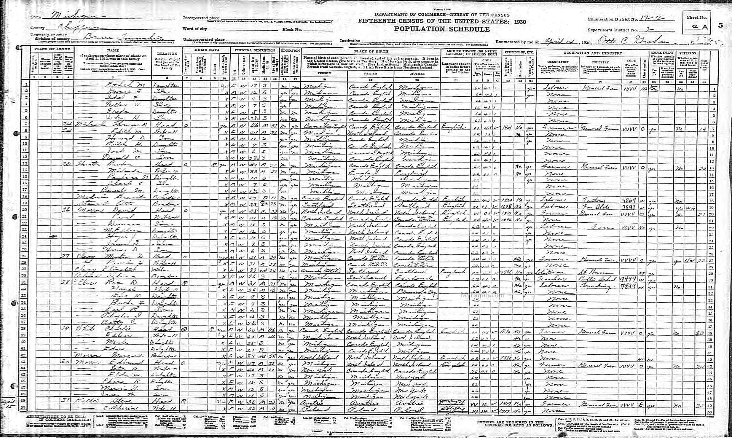 9. Melinda appeared in the household of Reuben HUNTER in the 1930 United States census on 14 April 1930 in Bruce Township, Chippewa, Michigan, United States. 1930_MI_Chippewa_17-2_2_02a 10. She was an occupant at the residence of Reuben HUNTER on 14 April 1930 in Bruce Township, Chippewa, Michigan, United States. This event was shared from Reuben HUNTER who also shared it with Beverly Marie HUNTER (1928-2018), Clark Everet HUNTER (1922-1999), Melinda PENNINGTON (1895-1990), and Pauline Gertrude HUNTER (1919-2014). 11. She had a residence on 21 March 1935 in Dafter, Chippewa, Michigan, United States. According to the obituary of her father, Charles Pennington. This event was shared with Reuben HUNTER (1890-1956). 12. Melinda was an occupant at the residence of Reuben HUNTER on 3 February 1938 in Sault Ste. Marie, Chippewa, Michigan, United States: Route 3. 68 68 At the time of the birth of their daughter, Shirley Jean. This event was shared from Reuben HUNTER who also shared it with Melinda PENNINGTON (1895-1990).
