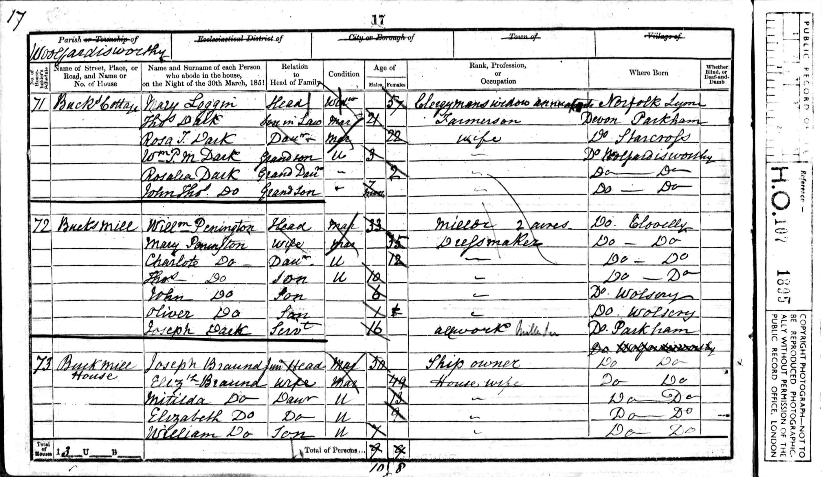 Another name for William was Penington. FamilySearch ID: L28J-1H4 General Notes: The family lived at The Old Mill, Bucks Mills, in Devon, which was a water mill. It was also known as the Temperance Hotel. 475 Noted events in his life were: 1. He worked as a Butcher, Miller. 467,477
