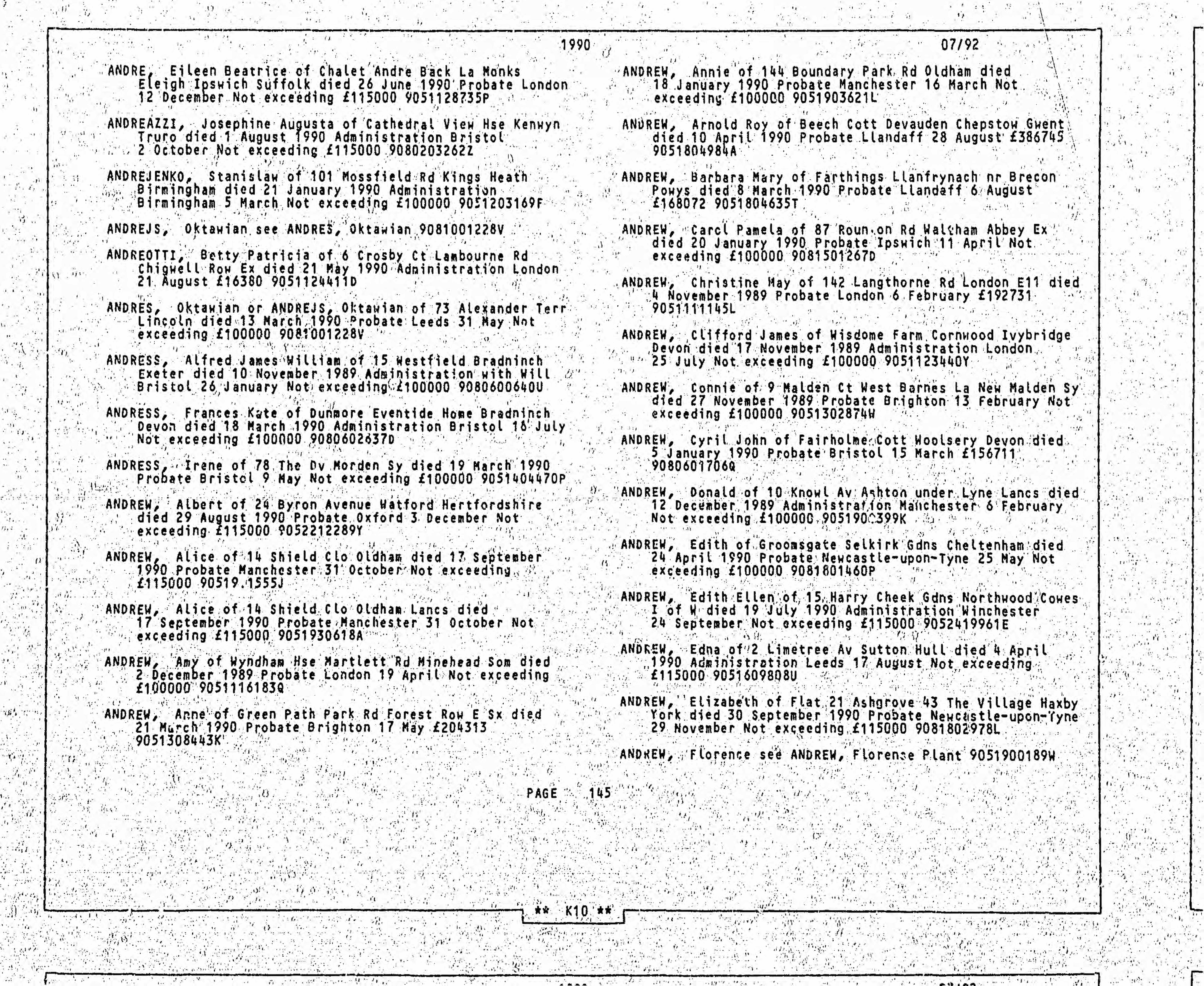 Name: Cyril John Andrew Birth Date: 26 Feb 1899 Date of Registration: Jan 1990 Age at Death: 90 Registration district: Bideford Inferred County: Devon Volume: 21 Page: 977