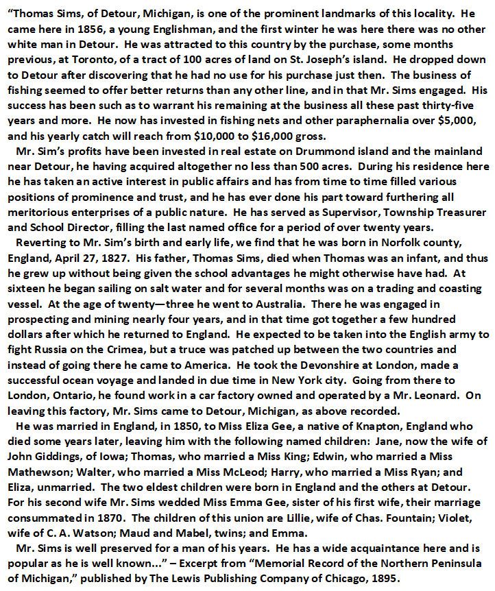 2. He appeared on the 1870 United States census in 1870 in De Tour Village, Chippewa, Michigan, United States. 1870 Warner Twp (now known as Detour) Chippewa Michigan Thomas Sims 43 M W Farmer England Jane Sims 17 F W Keeping House England (daughter) Thomas Sims 13 M W Clerk In Store Canada/West (son) Edwin Sims 11 M W Errand Boy Michigan (son) Walter Sims 9 M W ---------- Michigan (son) Harry Sims 4 M W ----------- Michigan (son) Eliza Sims 2 F W ----------- Michigan (daughter).