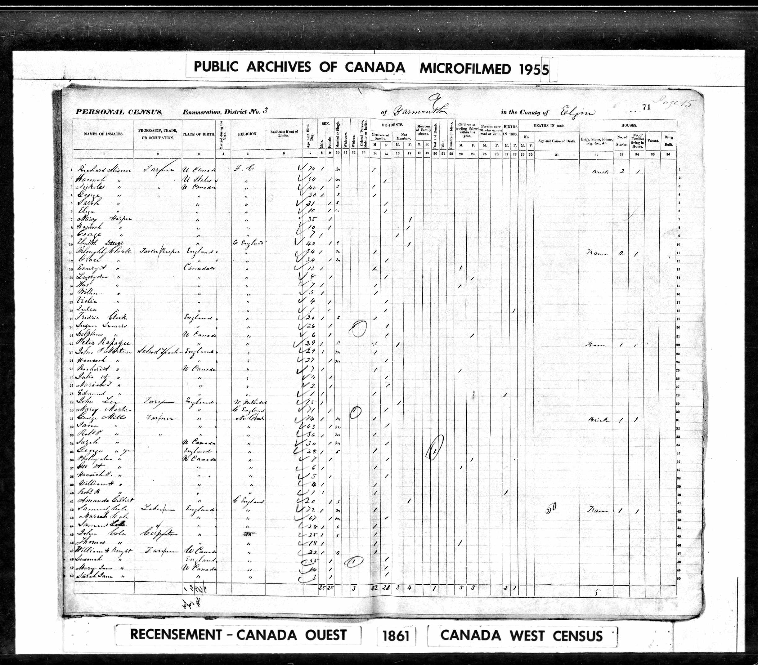 5. She appeared in the household of John Piper MARTYN [137] in the 1861 Canada census on 14 January 1861 in Yarmouth, Elgin, Ontario, Canada. This event was shared from John Piper MARTYN [137] who also shared it with Edmund Jonathan MARTYN [135] (1861-1944), Hannah MANN [138] (1834-1923), Julia Athena MARTYN [1236] (1856-1932), Maria Theresa MARTYN [1237] (1858-1952), Mary Bennet PIPER [1848] (1786-1872), and Richard Arthur MARTYN [1235] (1854-1889).