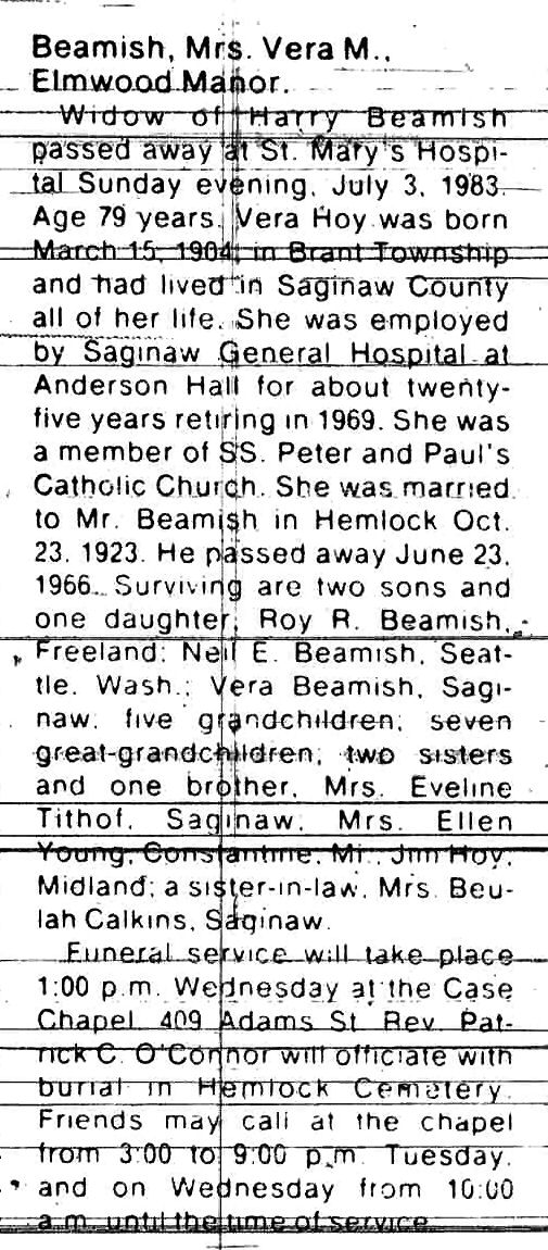 1. Her obituary was published in the Saginaw News on 5 July 1983 in Saginaw, Saginaw, Michigan, United States. Widow of Harry Beamish passed away at St. Mary's Hospital Sunday evening, July 3, 1983. Aged 79 years. Vera Hoy was born March 15, 1904 in Brant Township and had lived in Saginaw County all her life. She was employed by Saginaw General Hospital at Anderson Hall for about twenty five years retiring in 1969. She was a member of SS Peter and Paul's Catholic Church. She was married to Mr.Beamish in Hemlock, Oct. 23, 1923. He passed away June 23, 1966. Surviving are two sons and one daughter, Roy R. Beamish of Freeland, Neil E. Beamish, Seattle, Washington, Vera Beamish, Saginaw, five grandchildren, seven great-grandchildren, two sisters and one brother, Mrs. Eveline Tithof, Saginaw, Mrs. Ellen Young, Constatine, Mr. Jim Hoy, Midland, a sister-in-law Mrs. Beulah Calkins, Saginaw.