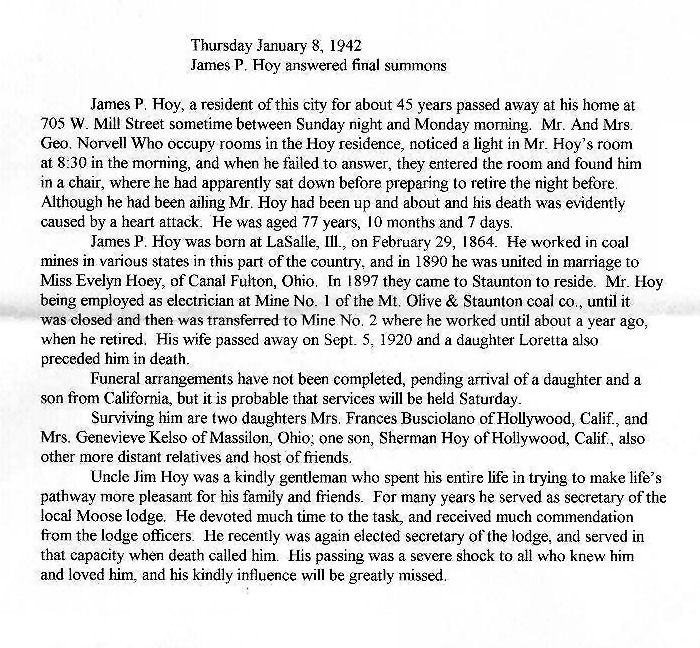 James P Hoy was born at LaSalle, Ill. on February 29, 1864. He worked in coal mines in various states in this part of the country, and in 1890 he was united in marriage to Miss Evelyn Hoey, of Canal Fulton, Ohio. In 1897 they came to Staunton to reside. Mr. Hoy being employed as electrician at Mine No. 1 of the Mt. Olive & Staunton coal co., until it was closed and then was transferred to Mine No. 2 where he worked until about a year ago, when he retired. His wife passed away on Sept 5, 1920 and a daughter Loretta also preceded him in death.