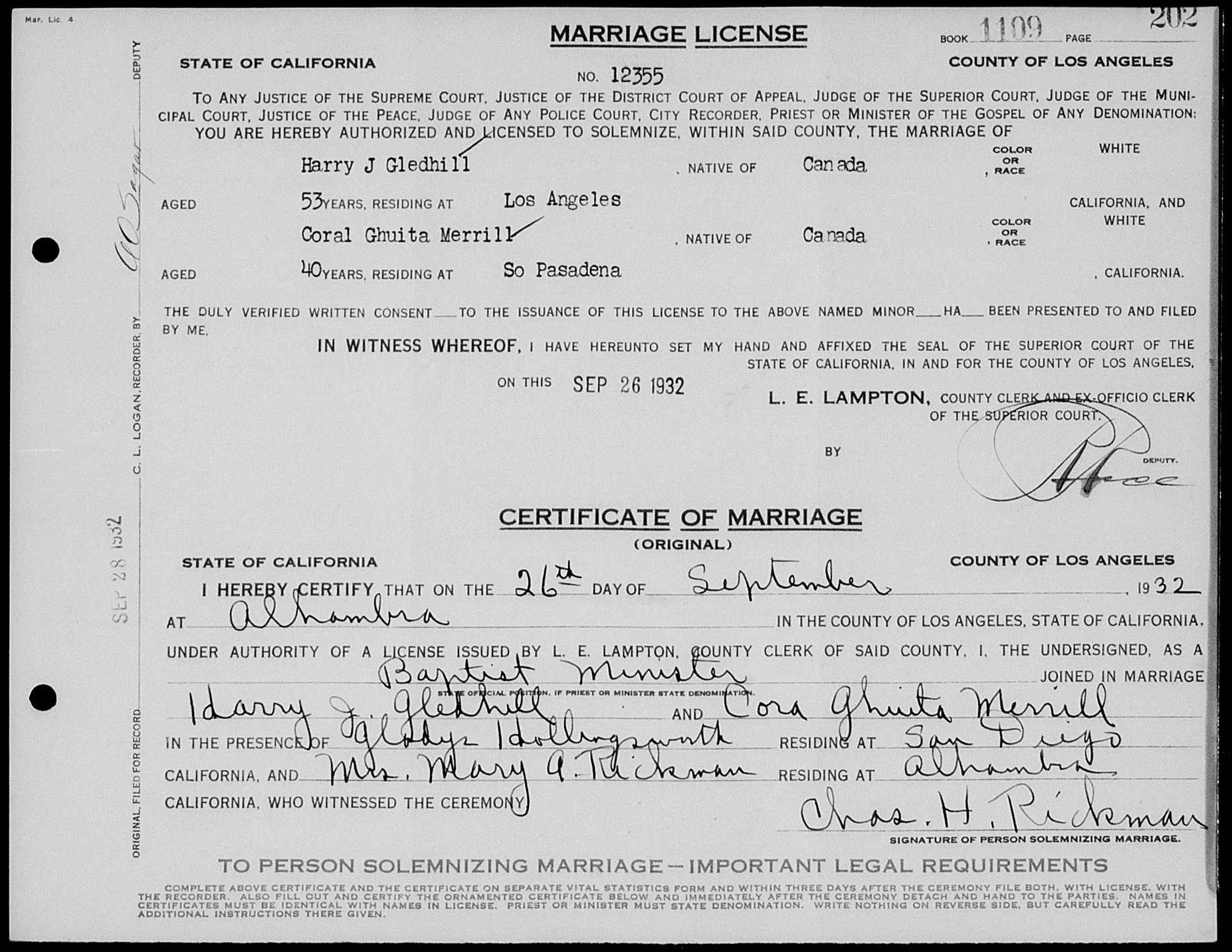 FamilySearch ID: LB1M-5M6 Coral married Alexander Ray MERRILL on 2 June 1920 in Toronto, York, Ontario, Canada. Coral next married Harry J. GLEDHILL on 26 September 1932 in Los Angeles, Los Angeles, California, United States. (Harry J. GLEDHILL was born in 1879.) Noted events in their marriage were: