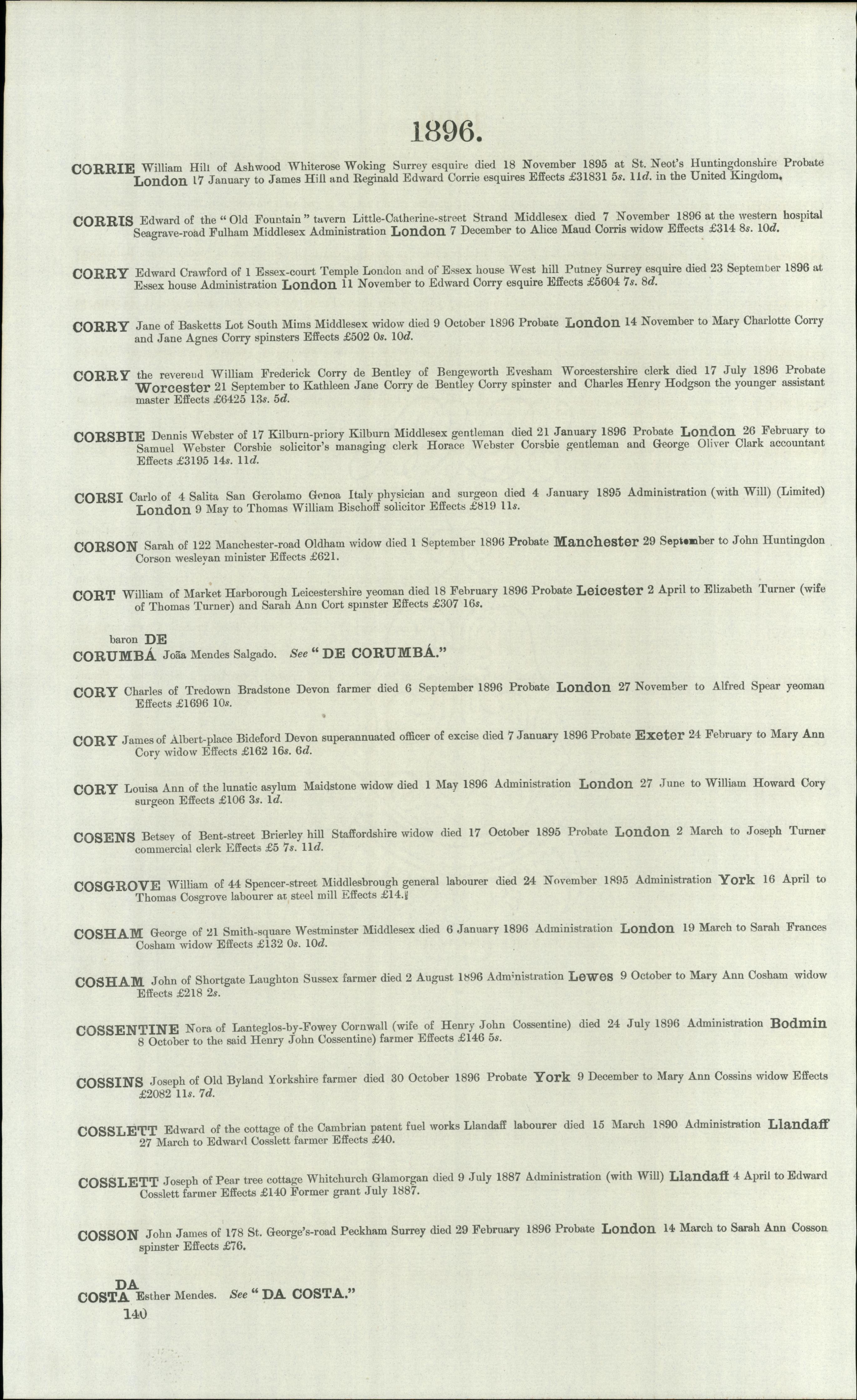 6. He had an estate probated to Mary Ann Cory, widow on 24 February 1896 in Exeter, , Devonshire, England.