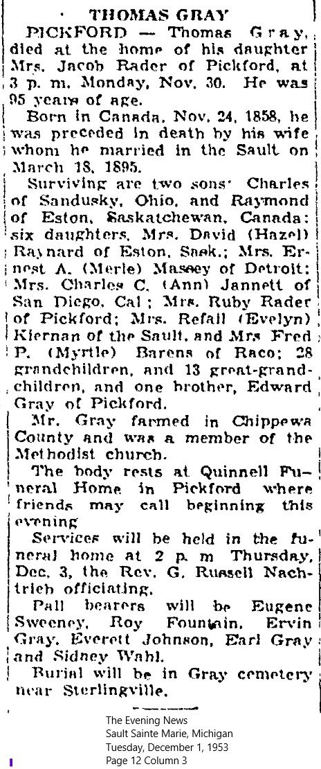 1. His obituary was published in The Evening News on 1 December 1953 in Sault Ste. Marie, Chippewa, Michigan, United States. Thomas married Catherine Almina TRIPP, daughter of Charles Allen TRIPP and Maria STREAVERS, on 18 March 1895 in Sault Ste. Marie, Chippewa, Michigan, United States. (Catherine Almina TRIPP was born on 14 November 1876 in Chatham, Kent, Ontario, Canada, died on 5 May 1942 in McCarron, Chippewa, Michigan, United States and was buried in May 1942 in Stirlingville, Chippewa, Michigan, United States.) Noted events in their marriage were: 1. They published an intent to marry Democrat/Sault Ste. Marie News - Page 10 on 23 March 1895 in Sault Ste. Marie, Chippewa, Michigan, United States. Marriage Notes: Joe and Ann Mateas stood up for them. |
