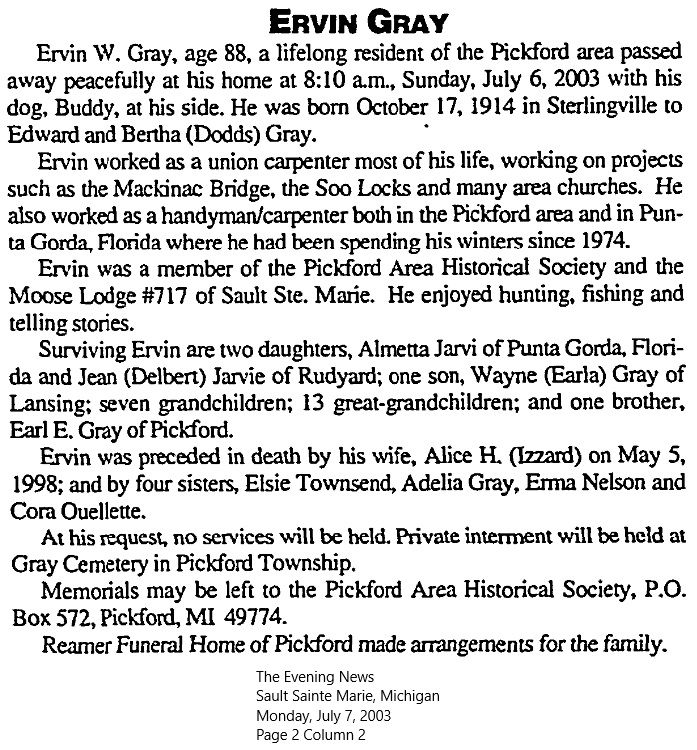 2. His obituary was published in The Evening News on 7 July 2003 in Sault Ste. Marie, Chippewa, Michigan, United States.