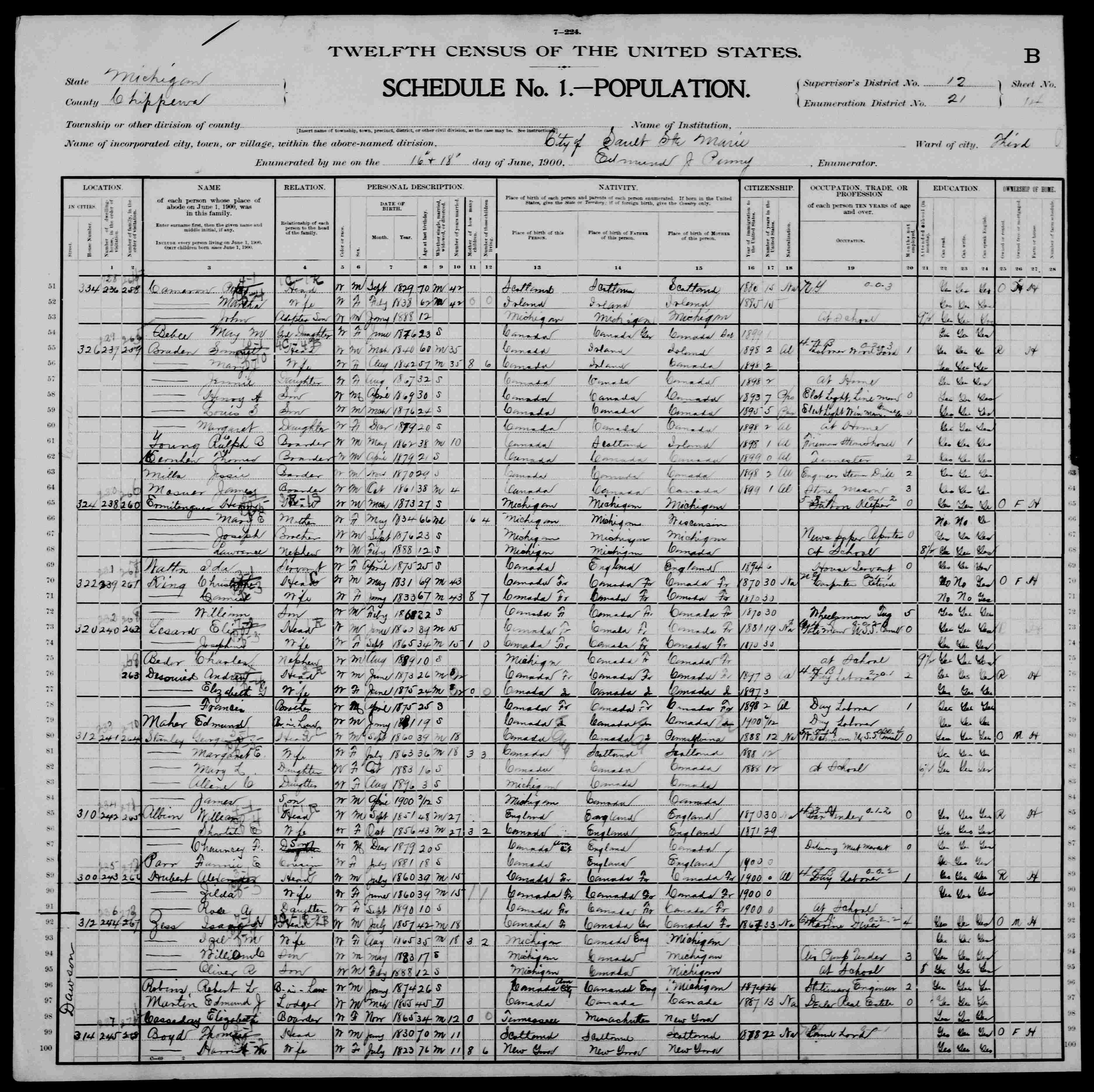 20. He appeared on the 1900 United States census on 16 June 1900 in Sault Ste. Marie, Chippewa, Michigan, United States. 111