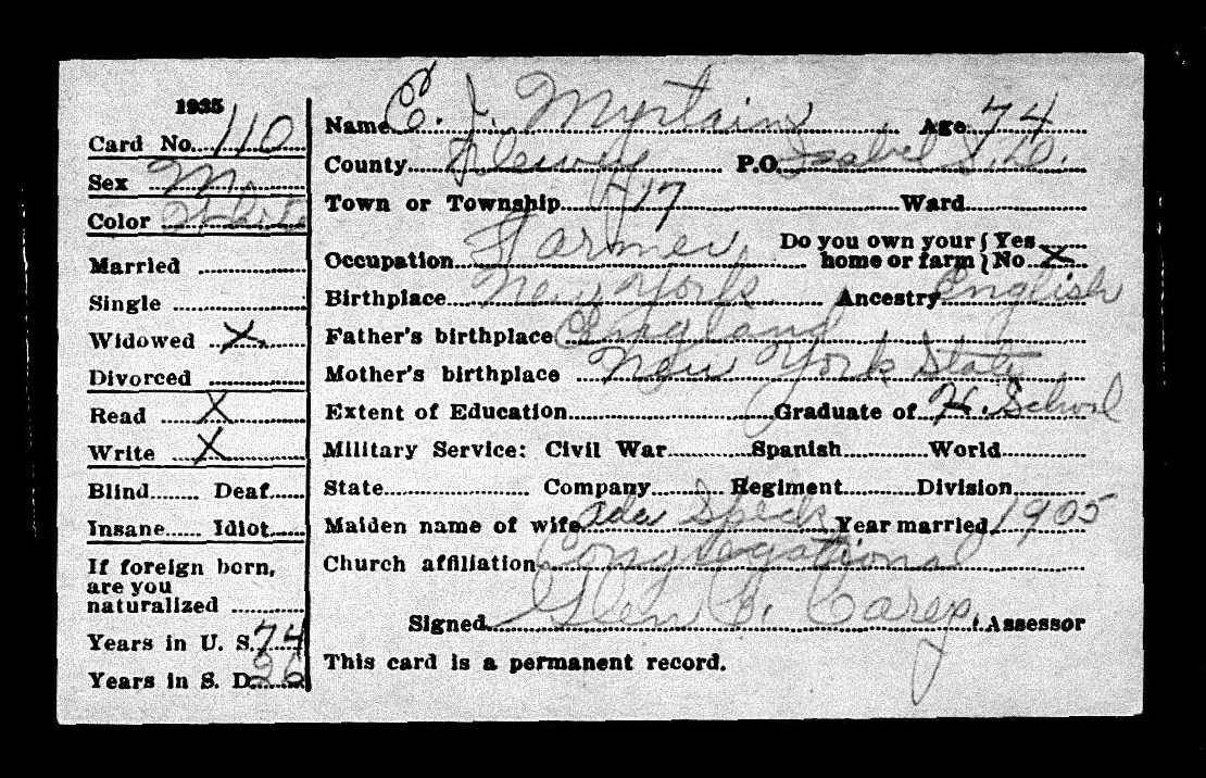 Card 168 J. Martyn, Age 58 County: Dewey, PO: Isabel, Township: 17 Occupation: Farmer Own Home/Farm? Yes Birthplace: New York Ancestry: Am Father's Birthplace: England Mother's Birthplace: New York Graduate: Br Col Church Affiliation: Con Male, White, Single, Can read and write Years in South Dakota: 16