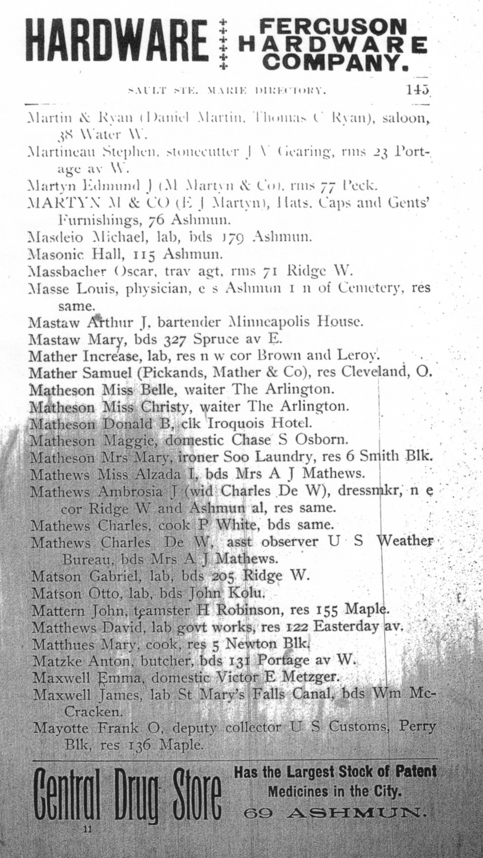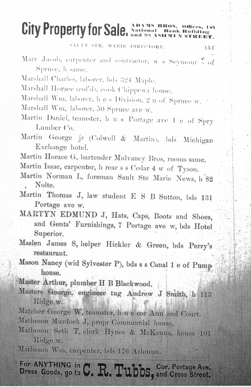 18. He worked as a Merchant in 1896 in Sault Ste. Marie, Chippewa, Michigan, United States. 109 MARTYN M & CO (E J Martyn), Hats, Caps and Gents' Furnishings, 76 Ashmun.
