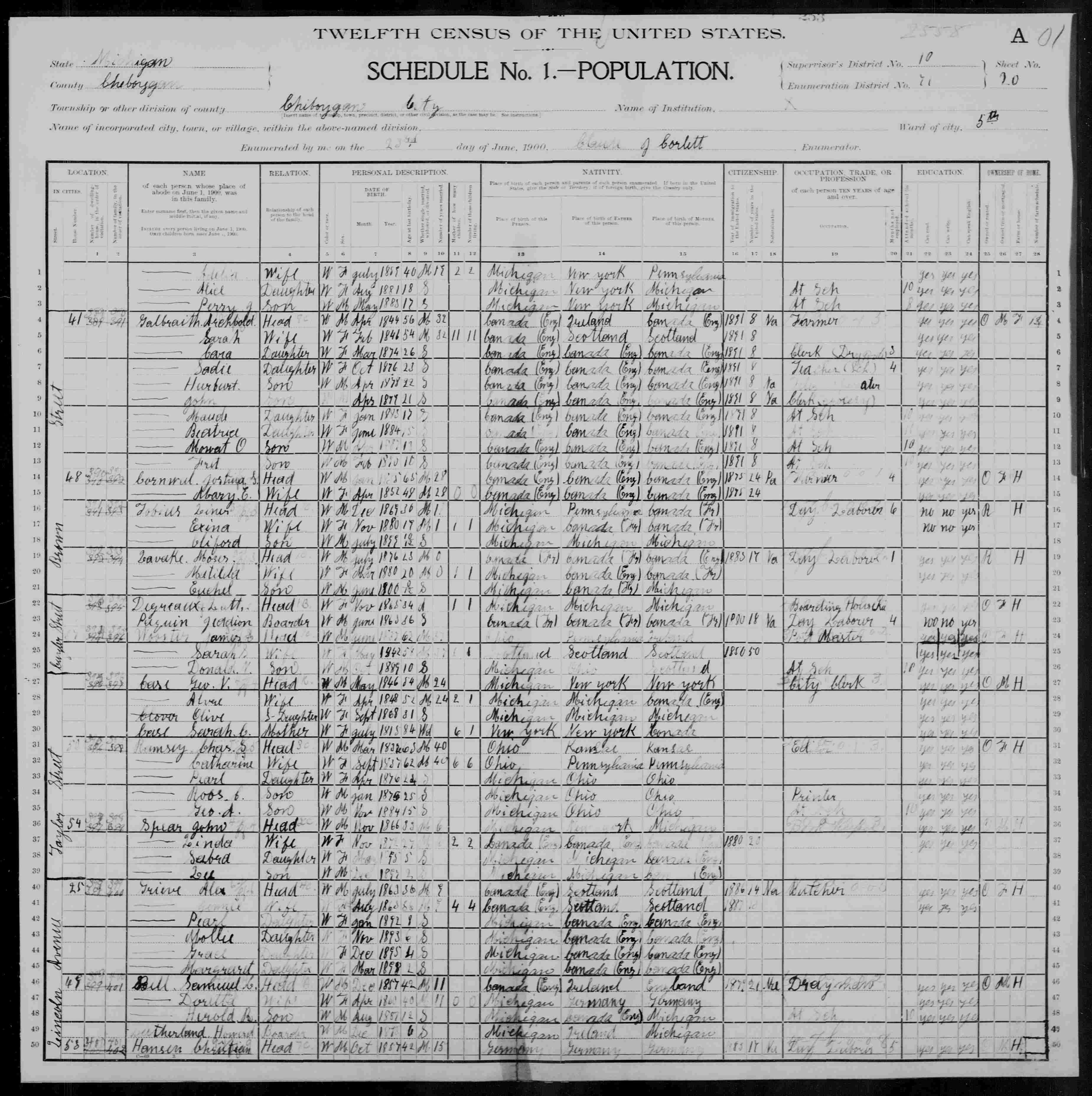 2. Grace appeared in the household of Alexander F. GRIEVE in the 1900 United States census on 23 June 1900 in Cheboygan, Cheboygan, Michigan, United States. 3. She was the head of household in the census of Alexander F. GRIEVE on 23 June 1900 in Cheboygan, Cheboygan, Michigan, United States: 25 Lincoln Avenue. 10 10 This event was shared from Alexander F. GRIEVE who also shared it with Agnes Pearl GRIEVE (1892-1983), Grace L. GRIEVE (1895-1990), Jane A. MITCHELL (1860-1920), Margaret GRIEVE (1898-1994), and Mollie J. GRIEVE (1893-1991).