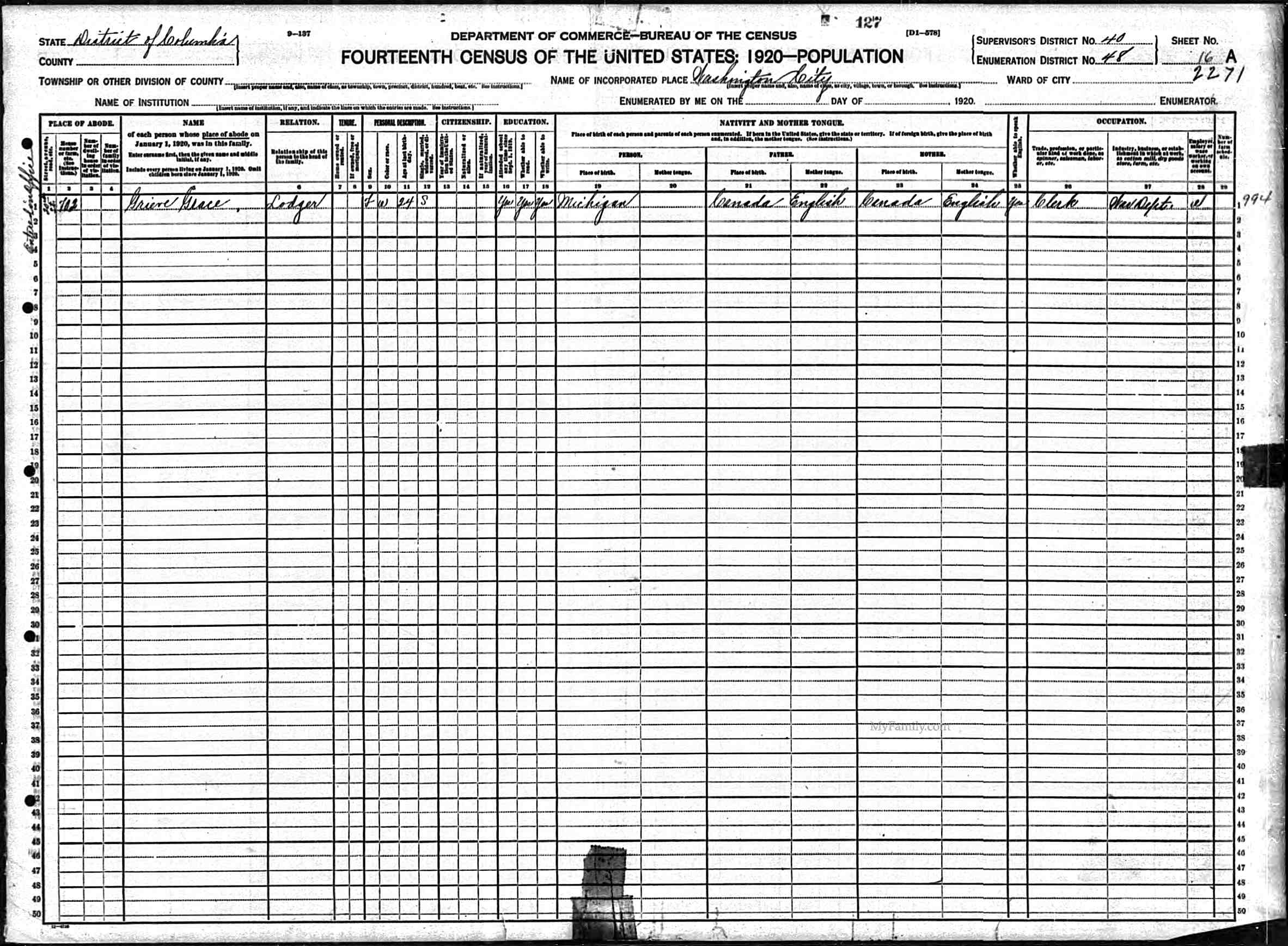 6. She appeared on the 1920 United States census on 21 January 1920 in Washington, District of Columbia, District of Columbia, United States. 7. She had a residence on 21 January 1920 in Washington, District of Columbia, District of Columbia, United States. 12 8. She had a residence on 8 September 1926 in Sault Ste. Marie, Chippewa, Michigan, United States. 9. Grace appeared in the household of Glenn Edmund MARTYN in the 326 Withington Avenue census on 26 September 1927 in Ferndale, Oakland, Michigan, United States. This event was shared from Glenn Edmund MARTYN who also shared it with Grace L. GRIEVE (1895-1990) and Sherly Jane MARTYN (1927-1927).