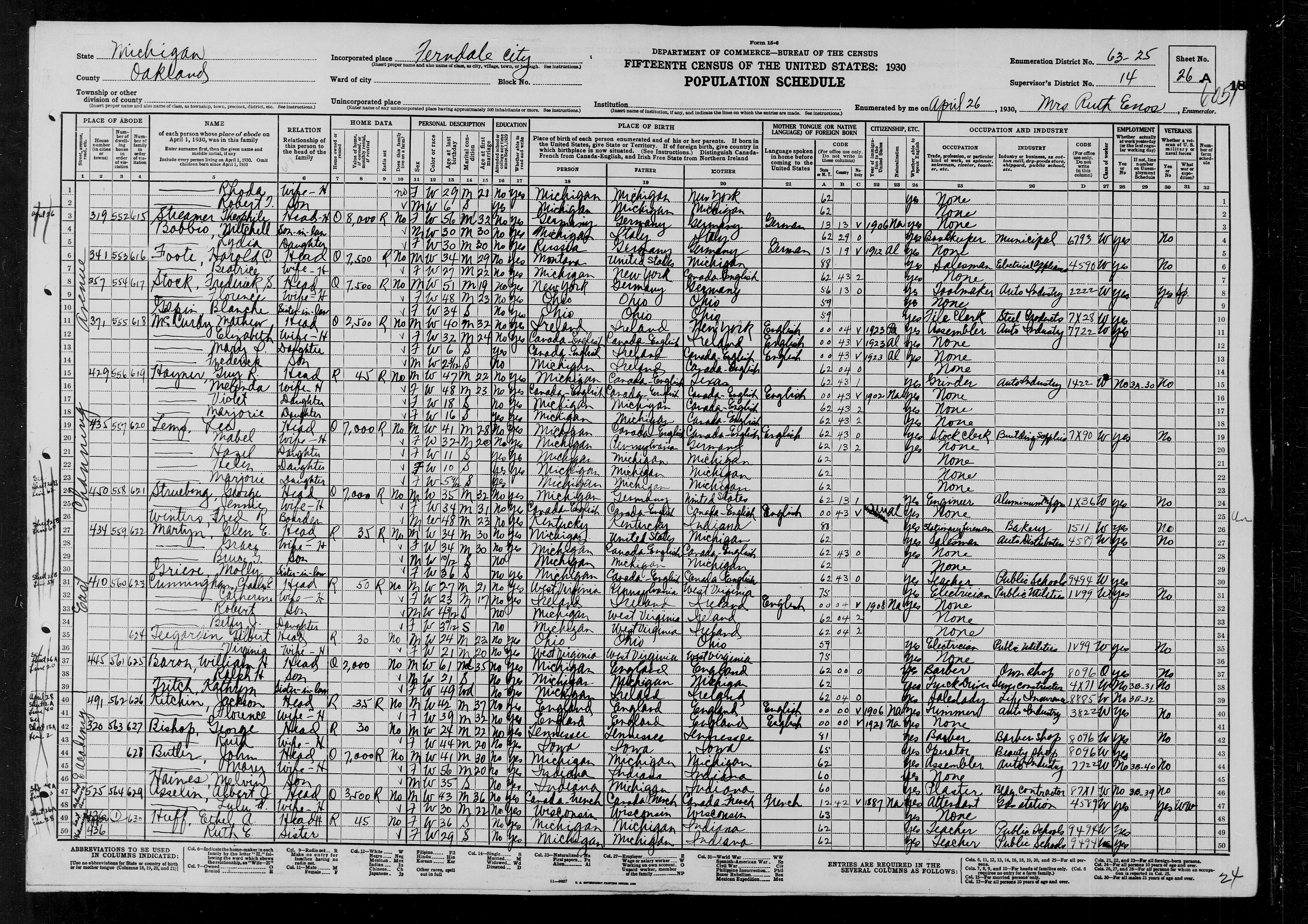 10. She appeared in the household of Glenn Edmund MARTYN in the 1930 United States census on 26 April 1930 in Ferndale, Oakland, Michigan, United States. 11. Grace was an occupant at the residence of Glenn Edmund MARTYN on 26 April 1930 in Ferndale, Oakland, Michigan, United States: 434 East Channey Avenue. This event was shared from Glenn Edmund MARTYN who also shared it with Bruce Glenn MARTYN (1929-), Grace L. GRIEVE (1895-1990), and Mollie J. GRIEVE (1893-1991). 12. She appeared in the household of Glenn Edmund MARTYN in the 317 Peck Street census on 1 April 1935 in Sault Ste. Marie, Chippewa, Michigan, United States.