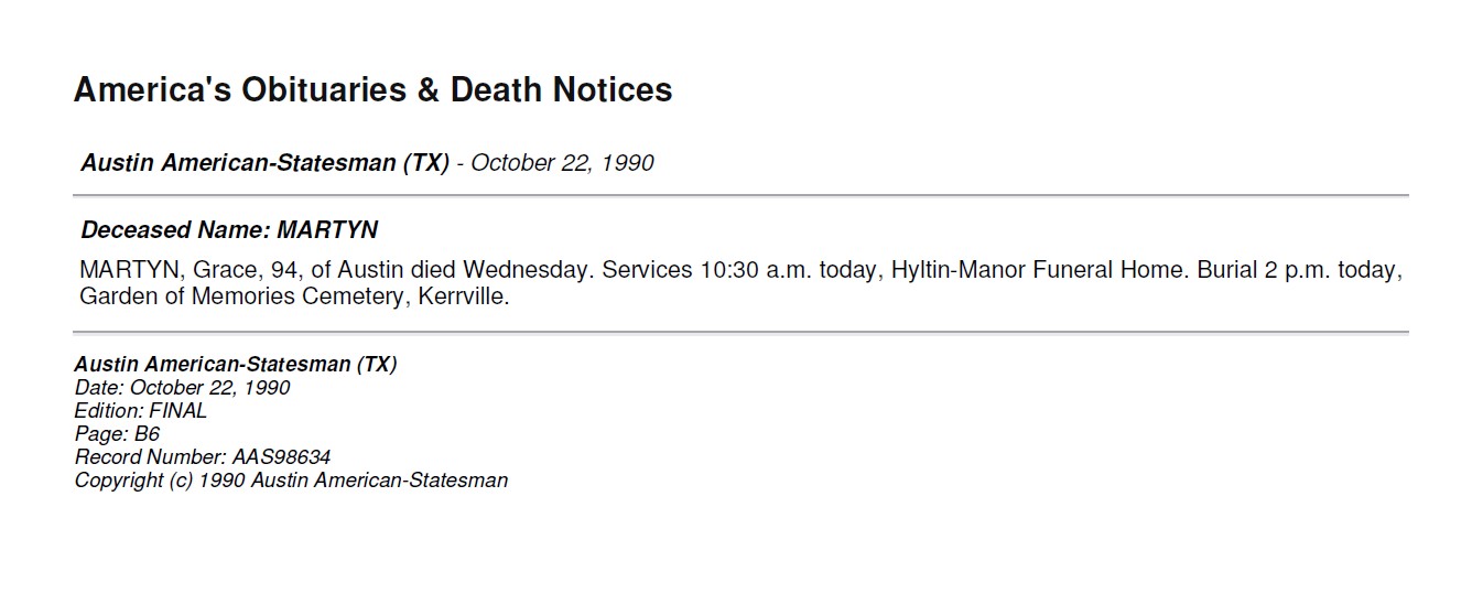 22. Her obituary was published in the Austin American-Statesman on 22 October 1990 in Kerrville, Kerr, Texas, United States. 13 Grace married Glenn Edmund MARTYN, son of Edmund Jonathan MARTYN and Fredricka Wilhemina RUEHLE, on 11 September 1926 in Drummond, Chippewa, Michigan, United States. (Glenn Edmund MARTYN was born on 27 November 1895 in Sault Ste. Marie, Chippewa, Michigan, United States 1,2,3, christened on 21 March 1896 in Sault Ste. Marie, Chippewa, Michigan, United States, died on 6 May 1987 in Kerrville, Kerr, Texas, United States 3,4 and was buried on 8 May 1987 in Kerrville, Kerr, Texas, United States.). The cause of his death was Apparent Heart Attack. Marriage Notes: