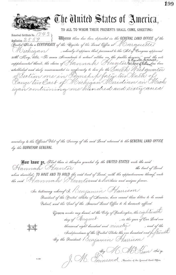 9. She owned acquired via the Homestead Act of 1862 on 18 August 1890 in , Chippewa, Michigan, United States. South west quarter of section one in Township forty-two, north of range two, east of Michigan Meridian in Michigan. Containing one hundred and sixty acres.