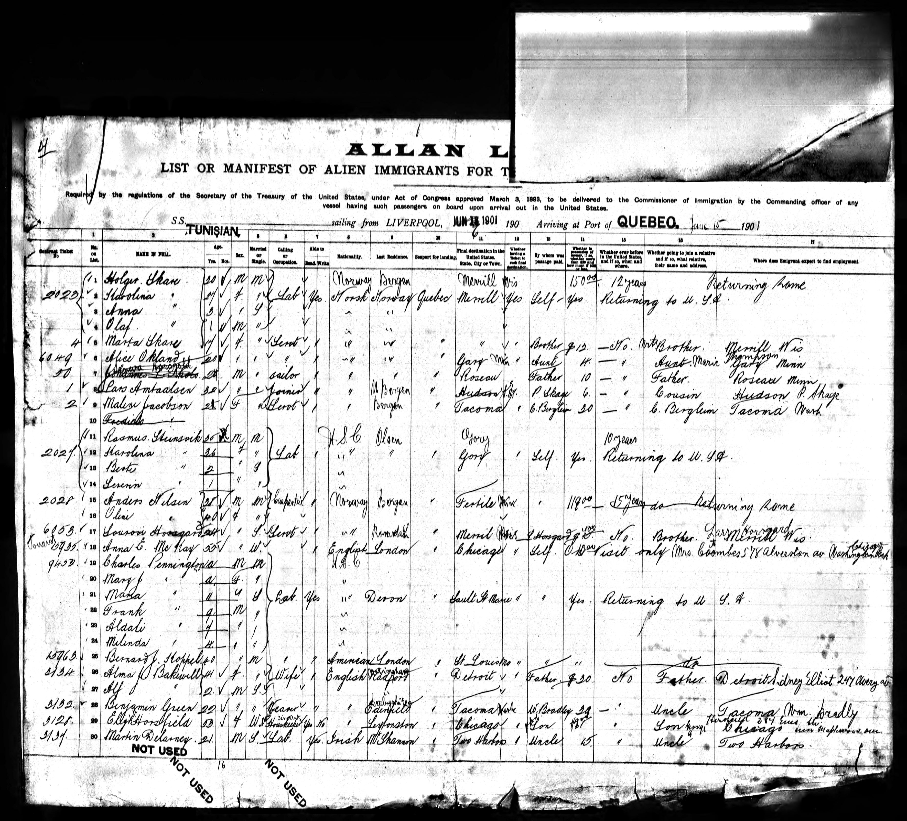 8. She was a fellow passenger to the travel of Charles Albert PENNINGTON Between 6 June 1901 and 15 June 1901: From Liverpool to the port of Quebec on the Tunisian. 76 9. She immigrated England on 18 June 1901 to , Chippewa, Michigan, United States. 67