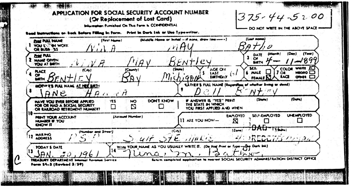 2. Her Social Security Number was 375-44-5200 on 20 January 1961 in Caledonia, Kent, Michigan, United States. Nina married James Douglas BATHO, son of William James BATHO and Agnes Isabelle BROWN. (James Douglas BATHO was born on 22 September 1891 in Pickford, Chippewa, Michigan, United States, died in June 1969 in Pickford, Chippewa, Michigan, United States and was buried in June 1969 in Bruce Township, Chippewa, Michigan, United States.) |