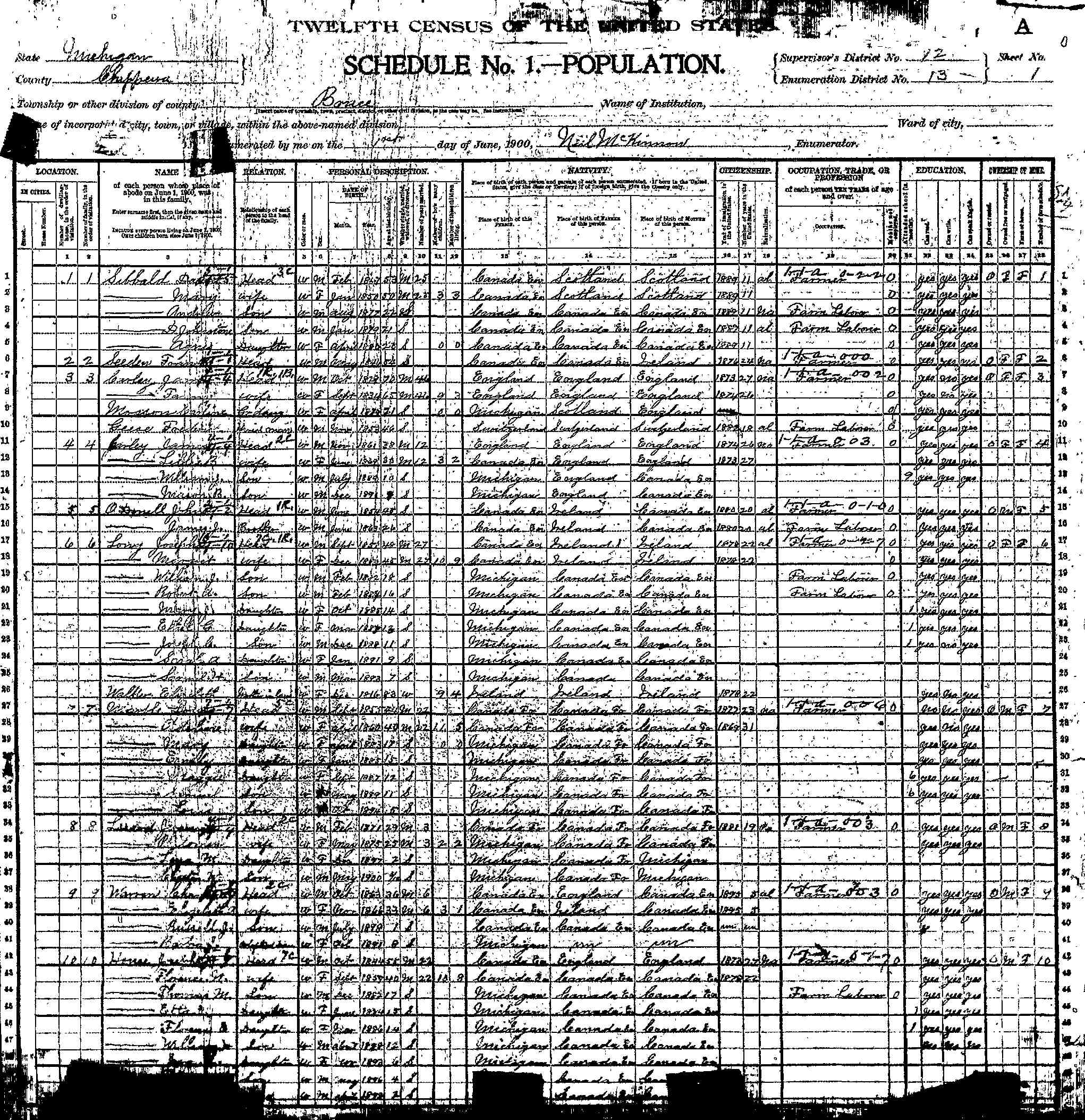 1. Mary appeared in the household of David SIBBALD in the 1900 United States census on 1 June 1900 in Bruce Township, Chippewa, Michigan, United States. Mary married David SIBBALD in 1875. (David SIBBALD was born in February 1847 in , , , Canada.) |