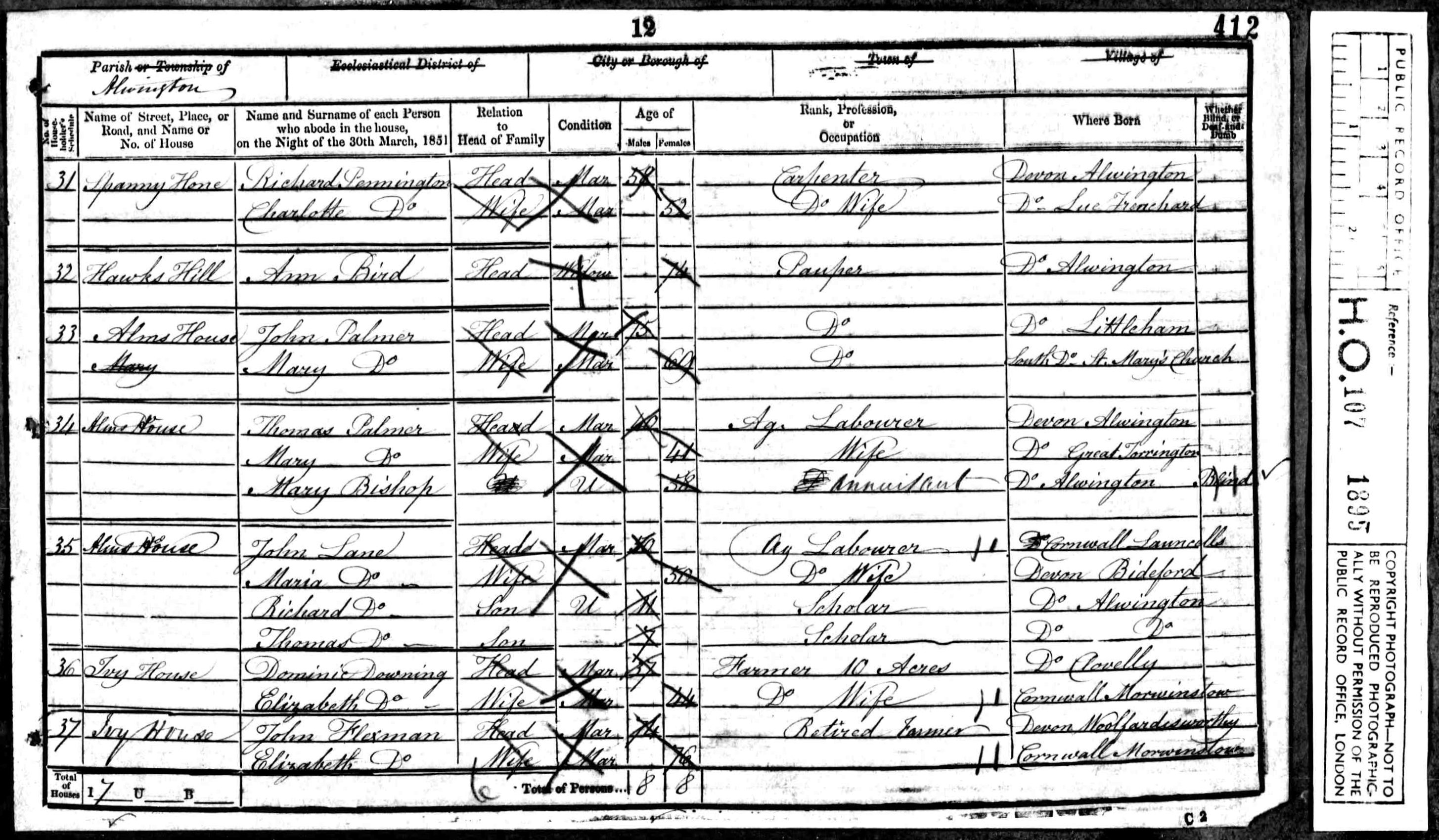 1. She appeared in the household of John FLEXMAN in the 1851 British census on 30 March 1851 in Alwington, , Devonshire, England. This event was shared from John FLEXMAN who also shared it with Elizabeth GALSWORTHY (Cir 1784-). Elizabeth married John FLEXMAN on 27 December 1805 in Morwenstow, , Cornwall, England.661 (John FLEXMAN was born circa 1784 in West Putford, , Devonshire, England 661.) |