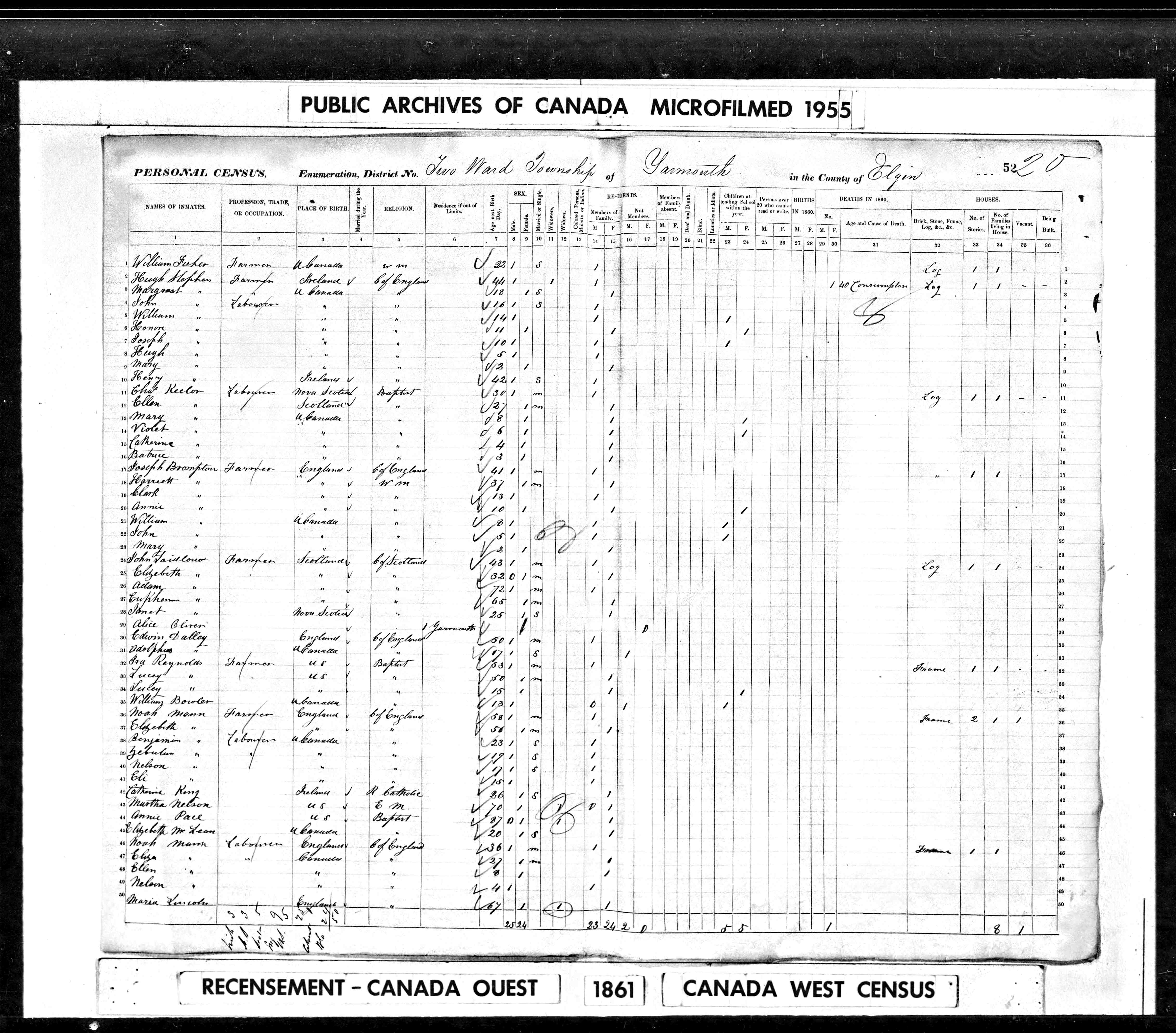 5. She appeared in the household of Noah MANN in the 1871 Canada census on 3 April 1871 in Yarmouth, Elgin, Ontario, Canada. J.P. Martyn was the census Enumerator.