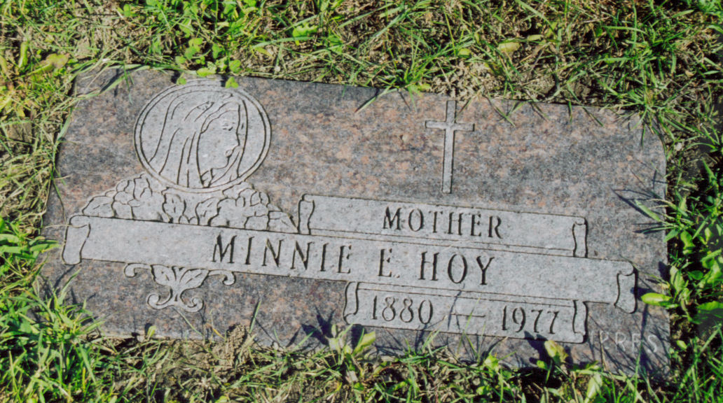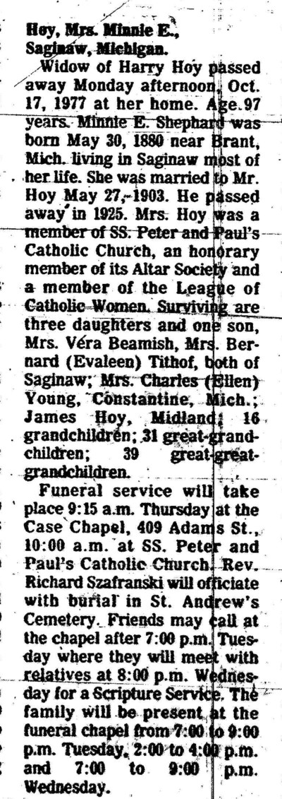 2. She was buried at the St. Andrews Cemetery in Saginaw, Saginaw, Michigan, United States on 20 October 1977. St. Andrews Cemetery Photos Minnie married Patrick Henry HOY [2122] [MRIN: 4090], son of James Patrick HOY [320] and Mary Jane McMURPHY [329], on 20 May 1903 in Chesaning, Saginaw, Michigan, United States. (Patrick Henry HOY [2122] was born on 17 November 1871 in , , Ohio, United States, died on 9 November 1925 in Saginaw, Saginaw, Michigan, United States and was buried on 12 November 1925 in Saginaw, Saginaw, Michigan, United States.) Noted events in their marriage were: