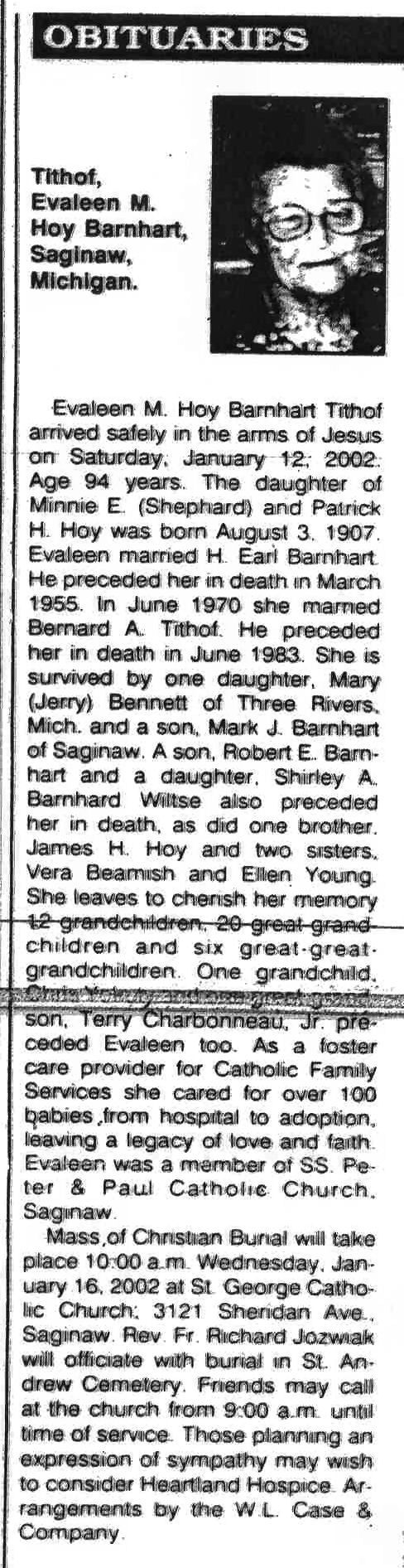 2. Her obituary was published in the Saginaw News on 15 January 2002 in Saginaw, Saginaw, Michigan, United States. Evaleen married Bernard A. TITHOF in June 1970. (Bernard A. TITHOF died in 1983.) Evaleen next married Henry Earl BARNHART. (Henry Earl BARNHART was born on 17 October 1903 in Maple Grove, Muskegon, Michigan, United States, died on 30 September 1955 in Saginaw, Saginaw, Michigan, United States and was buried in October 1955 in Saginaw, Saginaw, Michigan, United States.) |