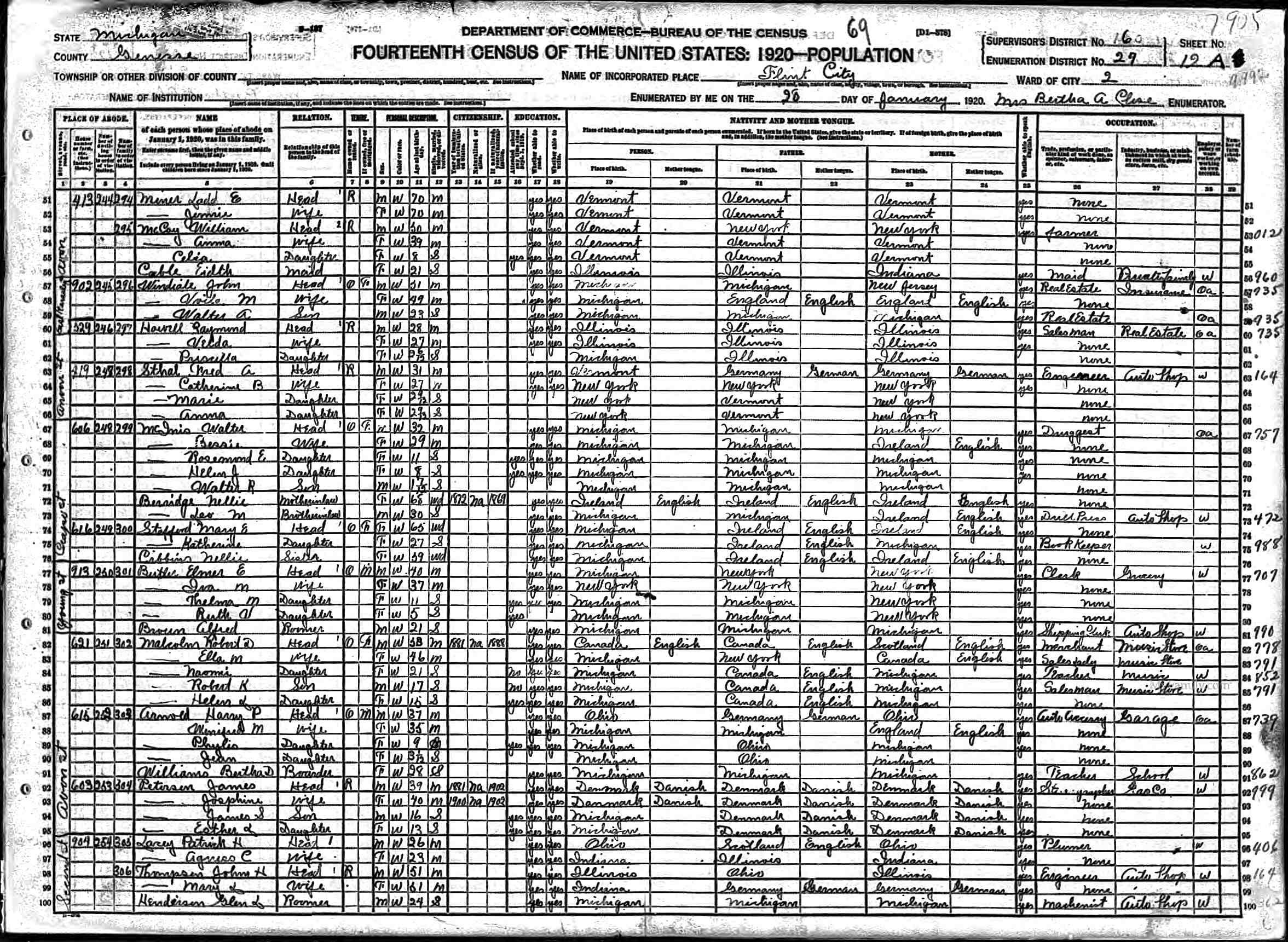 1. She appeared in the household of Patrick Henry LACEY in the 1920 United States census on 2 January 1920 in Flint, Genesee, Michigan, United States. This event was shared from Patrick Henry LACEY who also shared it with Agnes Cecila THOMPSON (-1962).