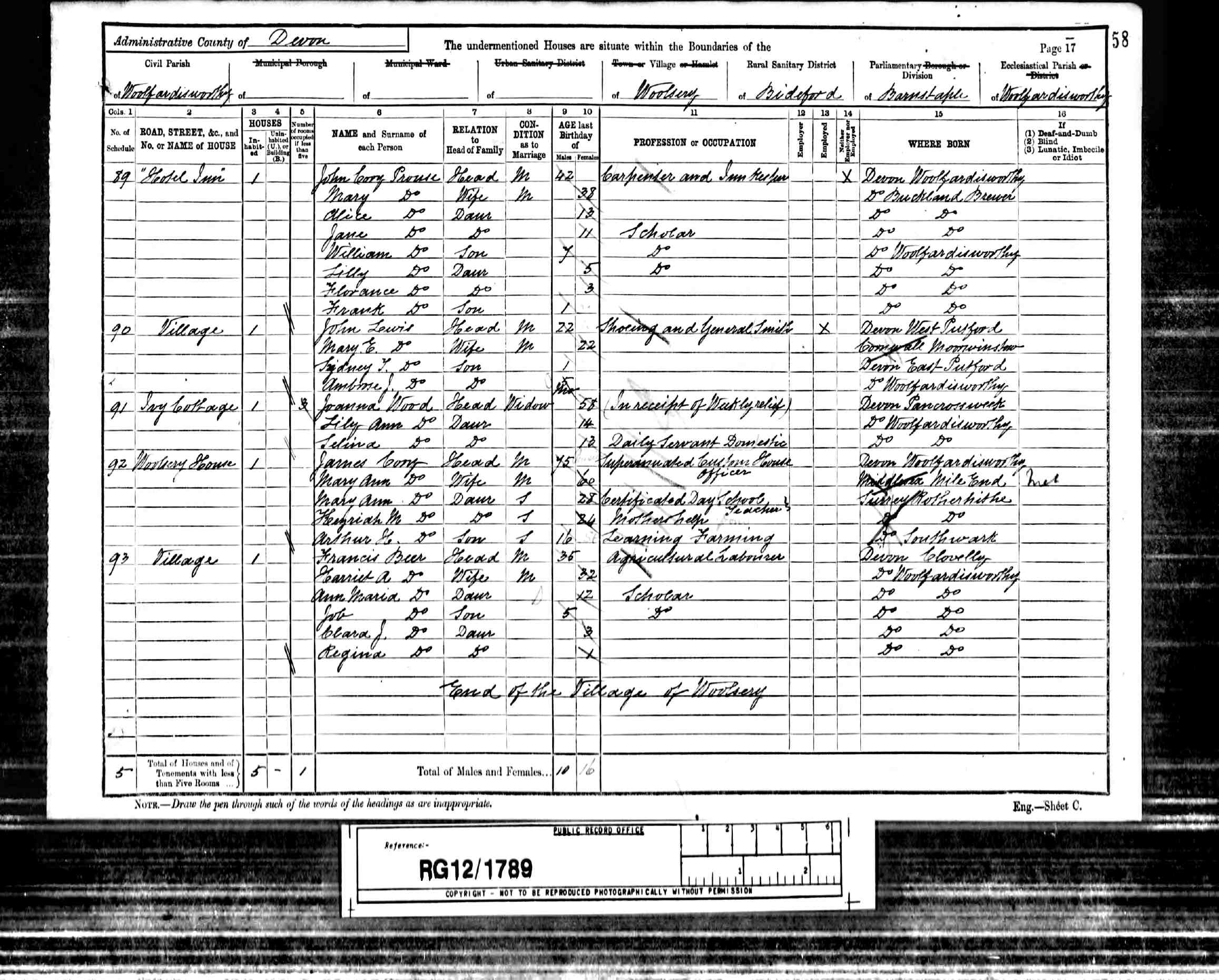 CORY, James Head M M 75 y Superintendant Customs House DEV Woolfardisworthy CORY, Mary Ann Wife M F 60 y MDX Mile End CORY, Mary Ann Dau S F 28 y Certificated Day School Teach SRY Rotherhithe CORY, Keizriah M Dau S F 24 y Mothers Help SRY Rotherhithe CORY, Arthur H Son S M 16 y Learning Farming SRY Southwark