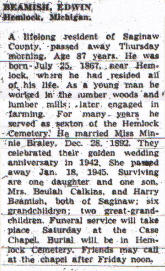 1. His obituary was published in the Saginaw News on 9 June 1955 in Saginaw, Saginaw, Michigan, United States. Edwin married Minnie BRALEY on 28 December 1892. (Minnie BRALEY was born on 3 September 1871 in , Lapeer, Michigan, United States, died on 18 January 1945 in Saginaw, Saginaw, Michigan, United States and was buried in January 1945 in Hemlock, Saginaw, Michigan, United States.) |