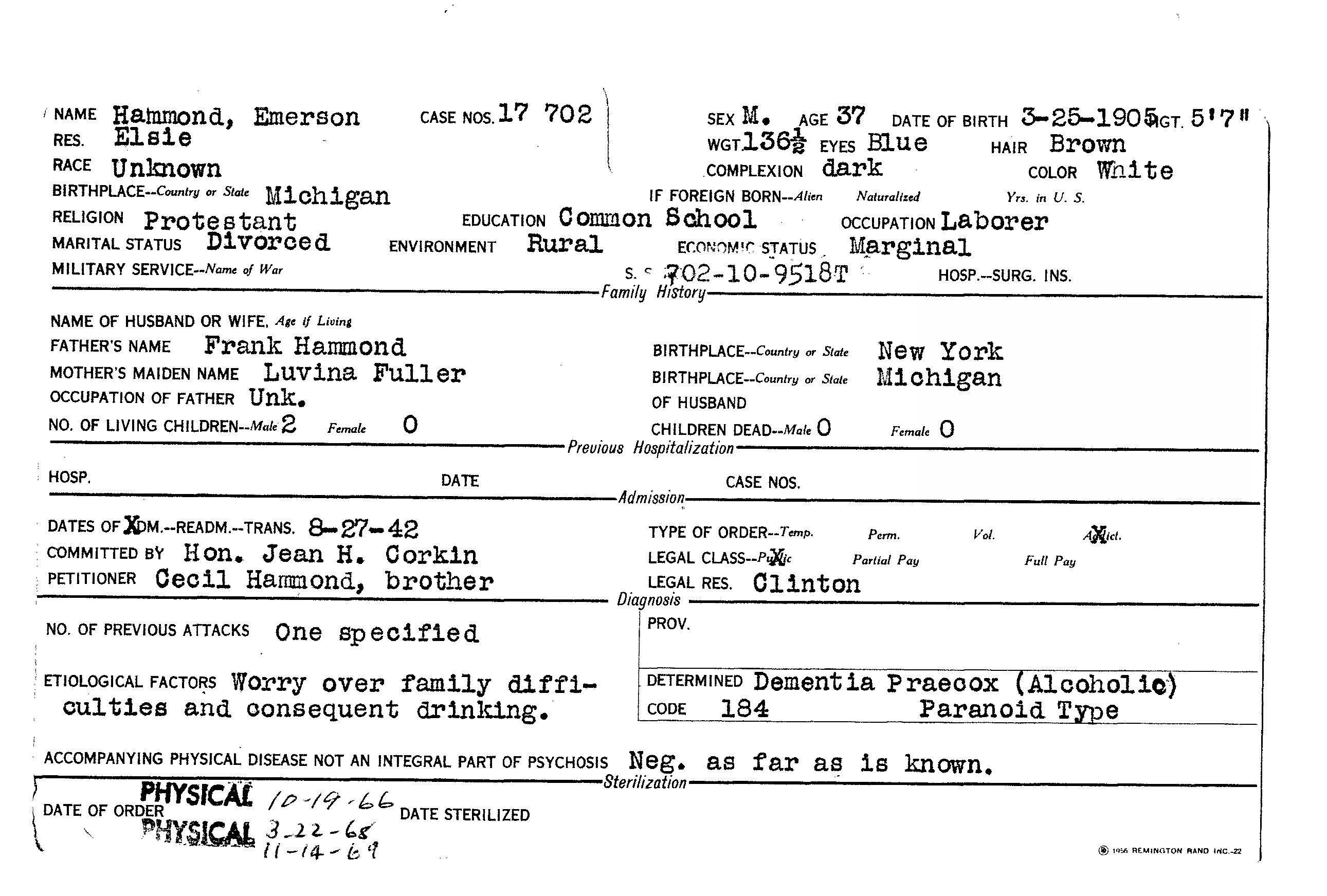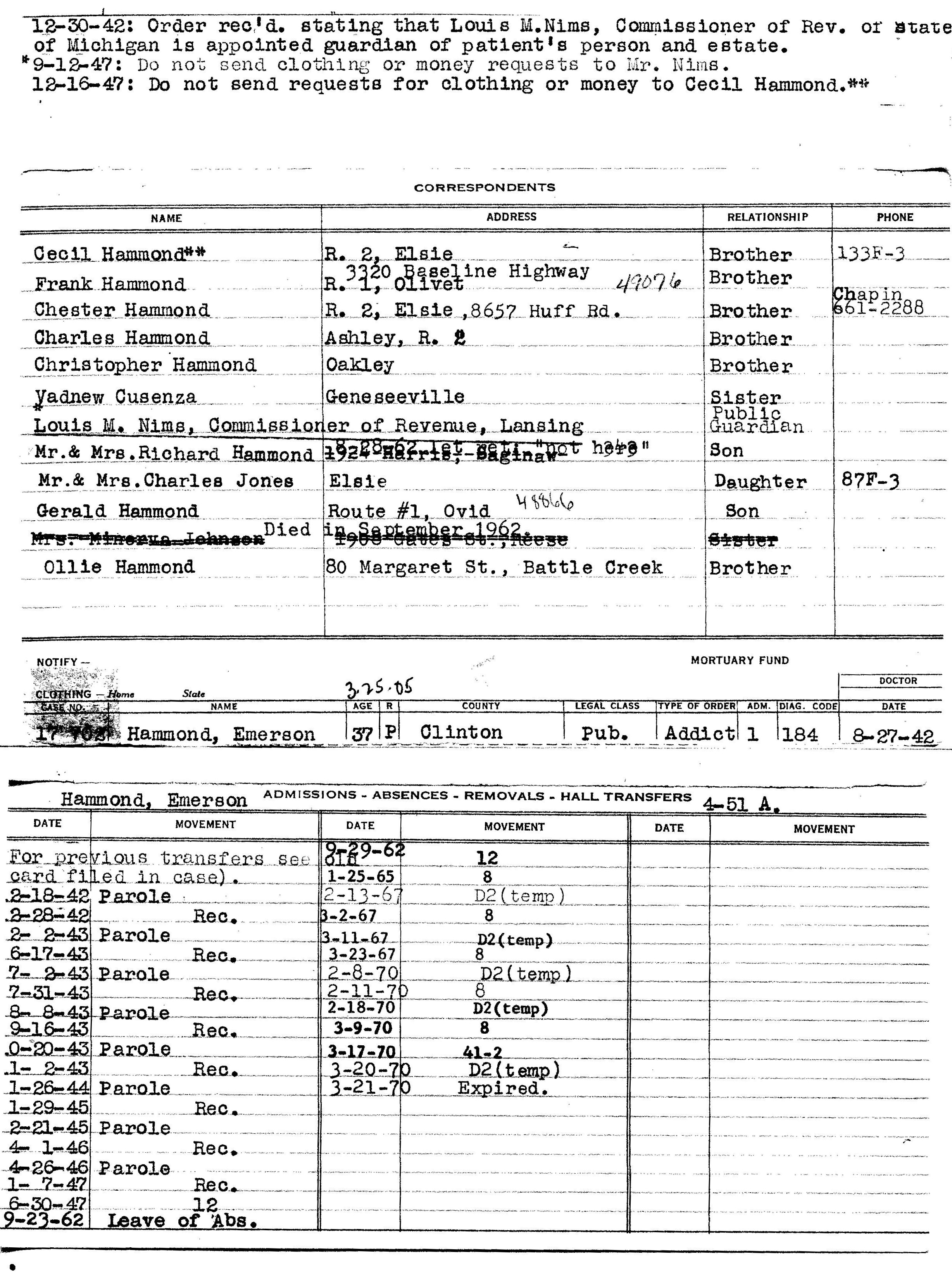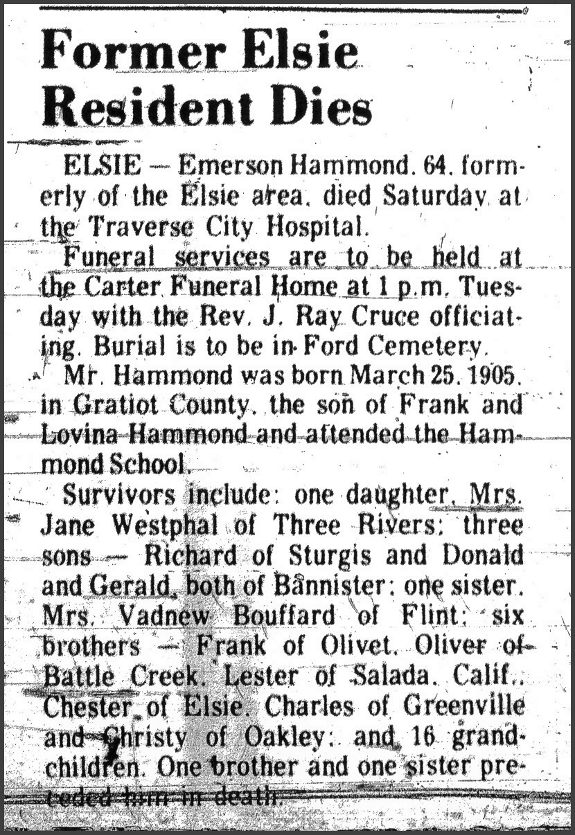 In August of 1942, Cecil petitioned Clinton County Court to have Emerson committed to Traverse City State Hospital as an alcoholic. This time, after being examined by doctors his commitment was ordered. 37 year old Emerson was admitted into the Traverse City State Hospital on Aug 27, 1942 as an alcoholic. At admission, Emerson was reported as 5'7" tall and weighing 136 1/2 llbs. He had brown hair, blue eyes and a dark complexion. Emerson would be in and out of this hospital the remainder of his life and died there at age 65 on March 21, 1970 from a heart attack. He is buried in Ford Cemetery in Elsie, MI next to his parents. He has no marker on his grave.