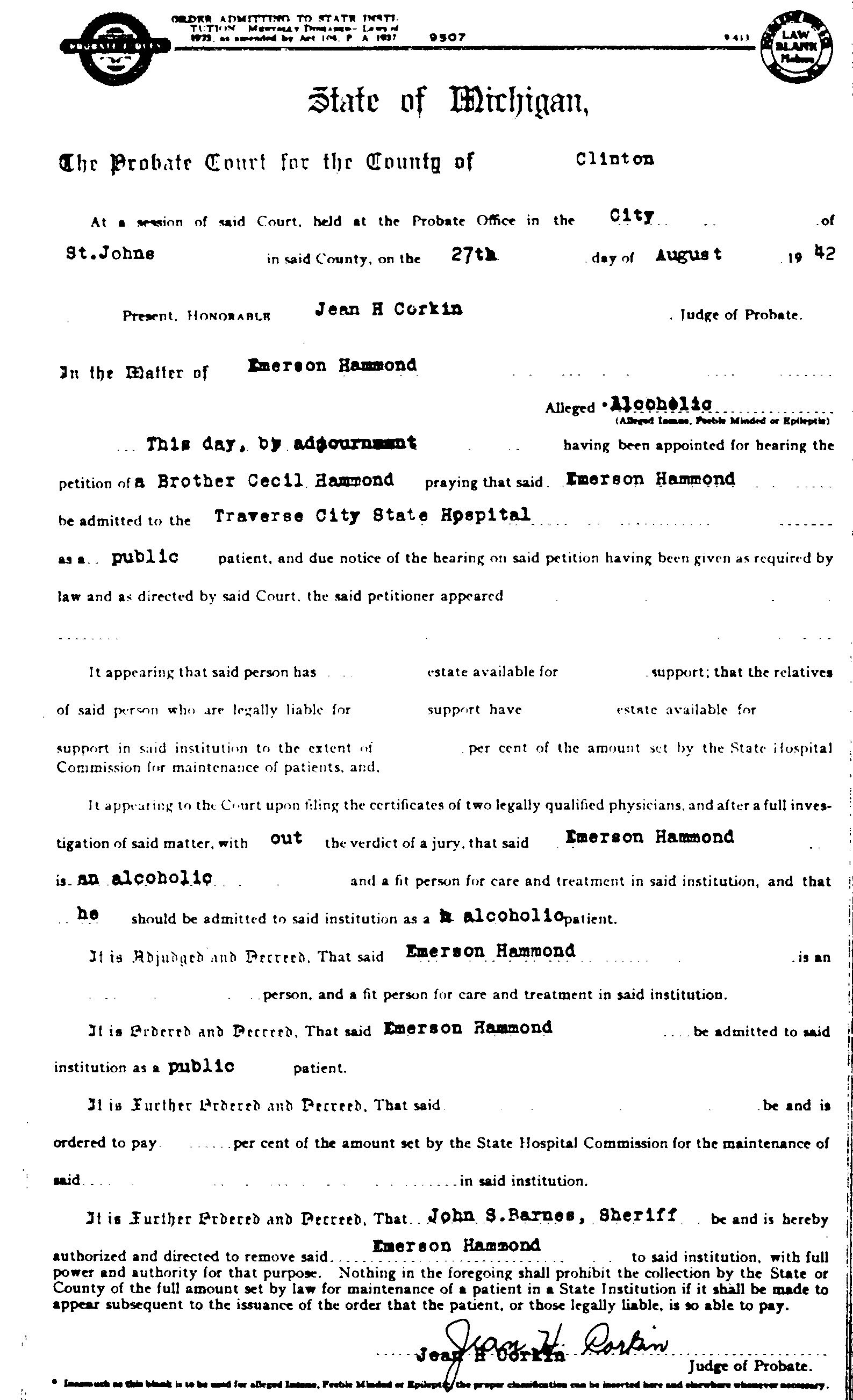 1. He received medical attention for Alcholism on 27 August 1942 in Traverse City, Grand Traverse, Michigan, United States. St Johns, Clinton County, MI, Per the attached court order, Emerson was committed to Traverse City State Hospital as an alcoholic. (Traverse City State Hospital, 830 Cottageview Drive, Traverse City, Michigan 49684, United States.)