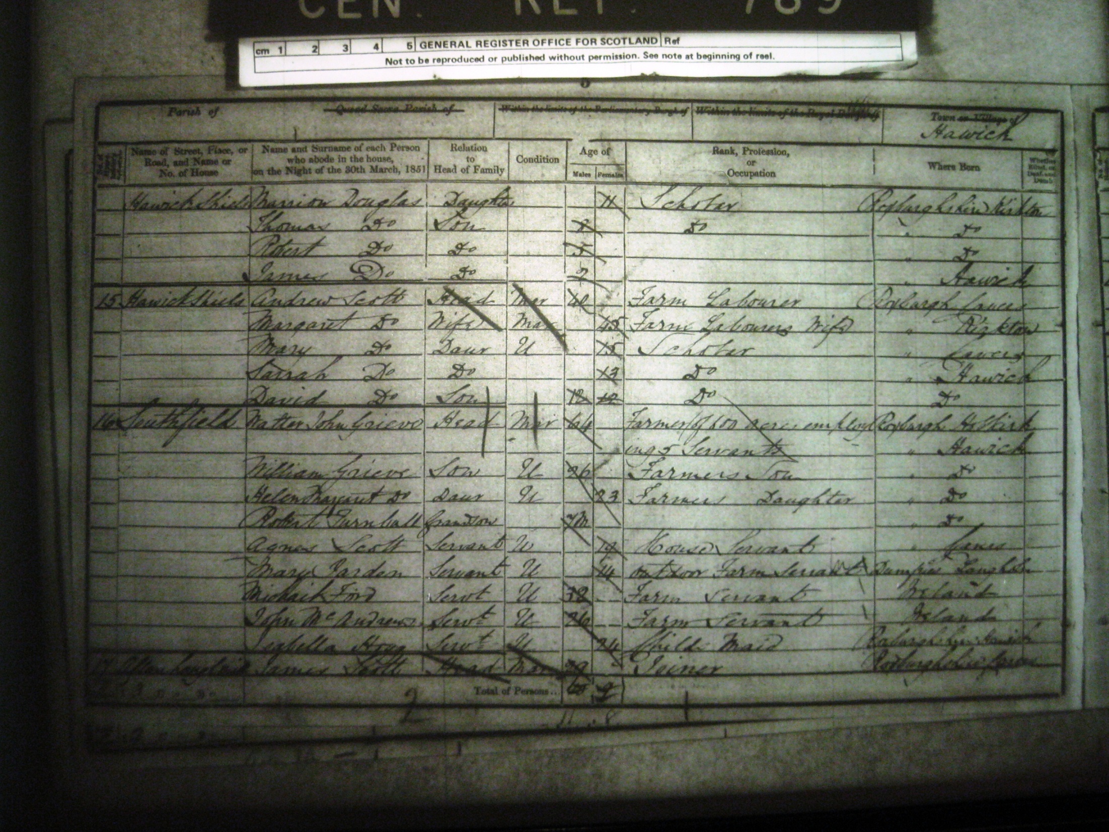 5. William was an occupant at the residence of Walter John GRIEVE on 30 March 1851 in Hawick, Roxburghshire, Scottish Borders, Scotland: Southfield Farm. (Southfield Farm, Hawick, Roxburgh TD9 0PE, Scotland.) He owned a 600 acre farm near Hawick and had 5 servants.