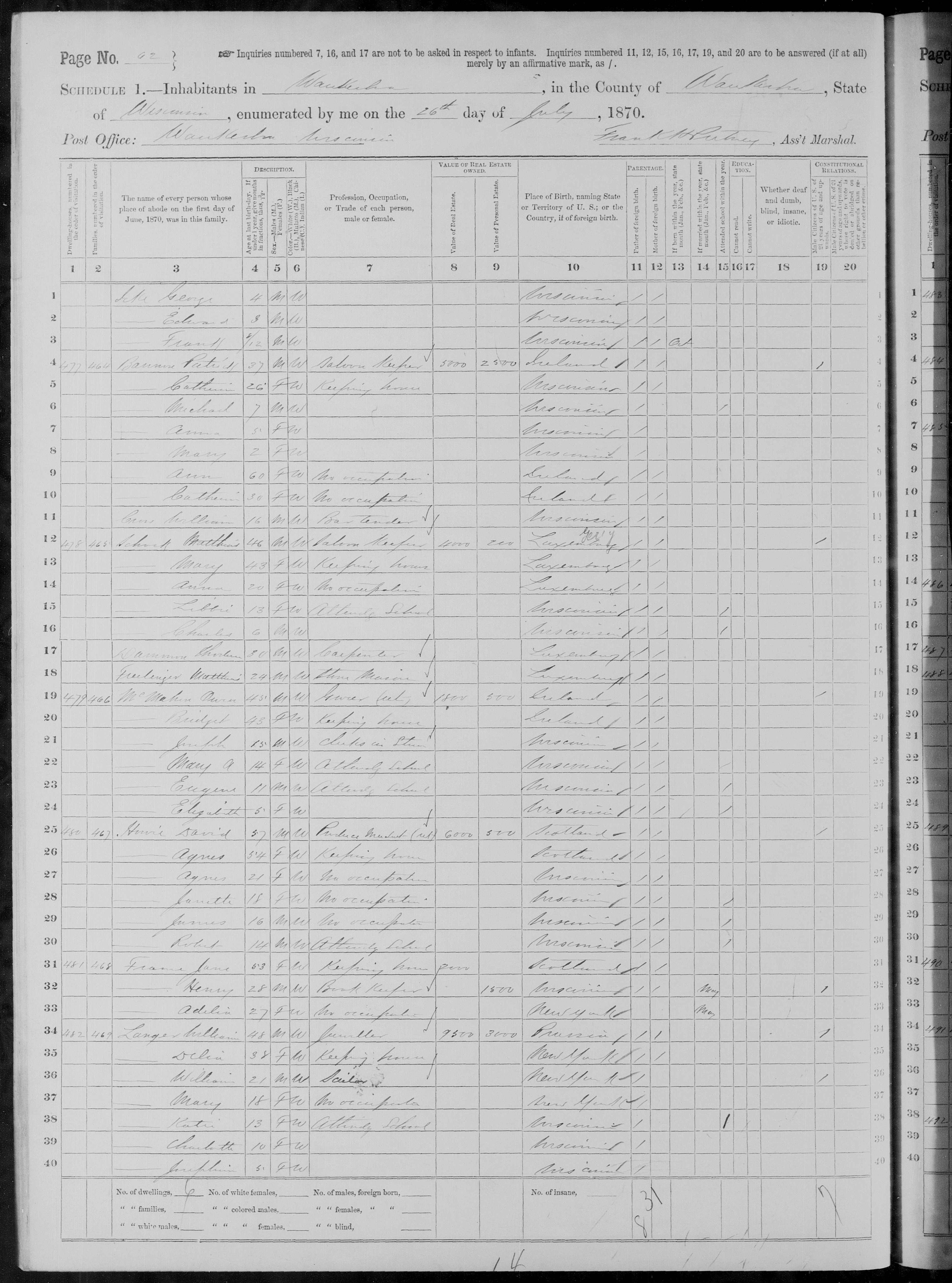 1. Eugene appeared in the household of Owen McMAHON Jr. in the 1870 United States census on 26 July 1870 in Waukesha, Waukesha, Wisconsin, United States.