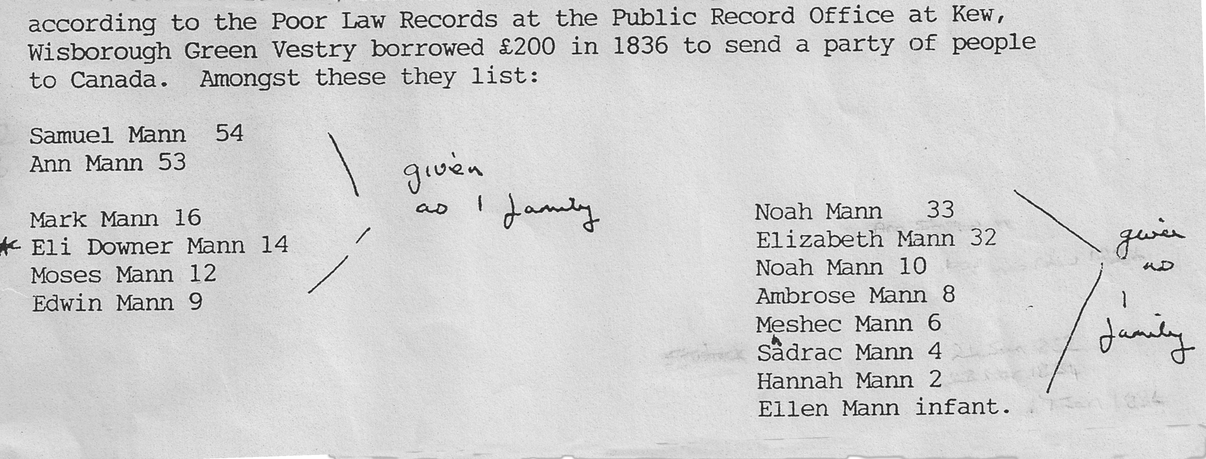 According to Poor Law records at the Public Record Office at Kew, Wisborough Green Vestry borrowed £200 in 1836 to send a party of people to Canada. Among these they listed the following: