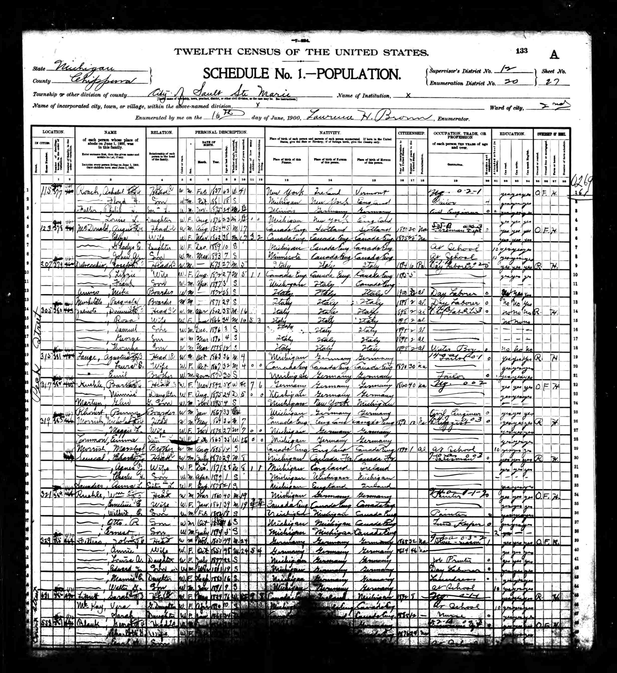4. She appeared in the household of Nicholas D. MORRISH in the 1900 United States census on 16 June 1900 in Sault Ste. Marie, Chippewa, Michigan, United States.