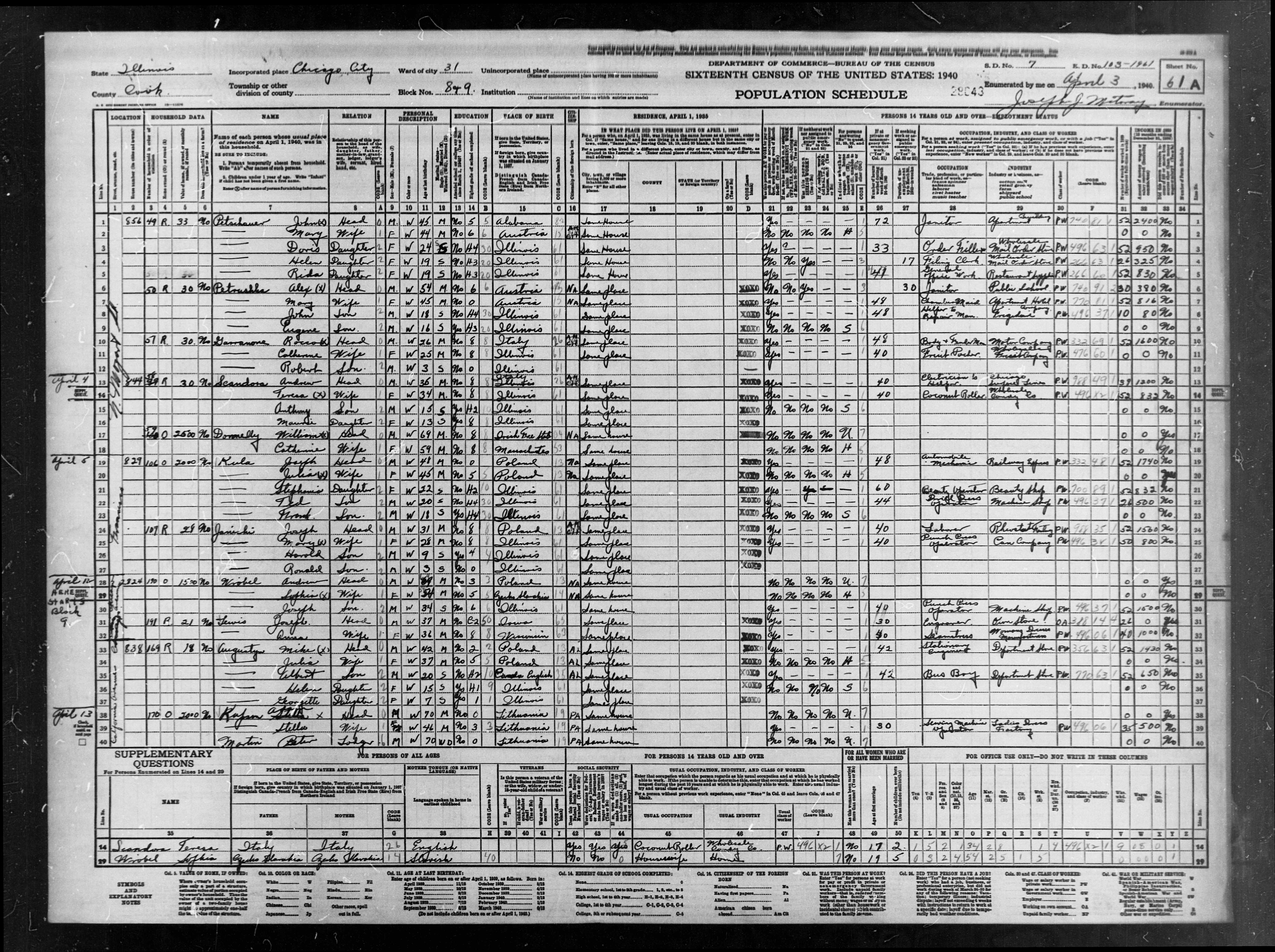 2. He appeared on the 1940 United States census on 5 April 1940 in Chicago, Cook, Illinois, United States.