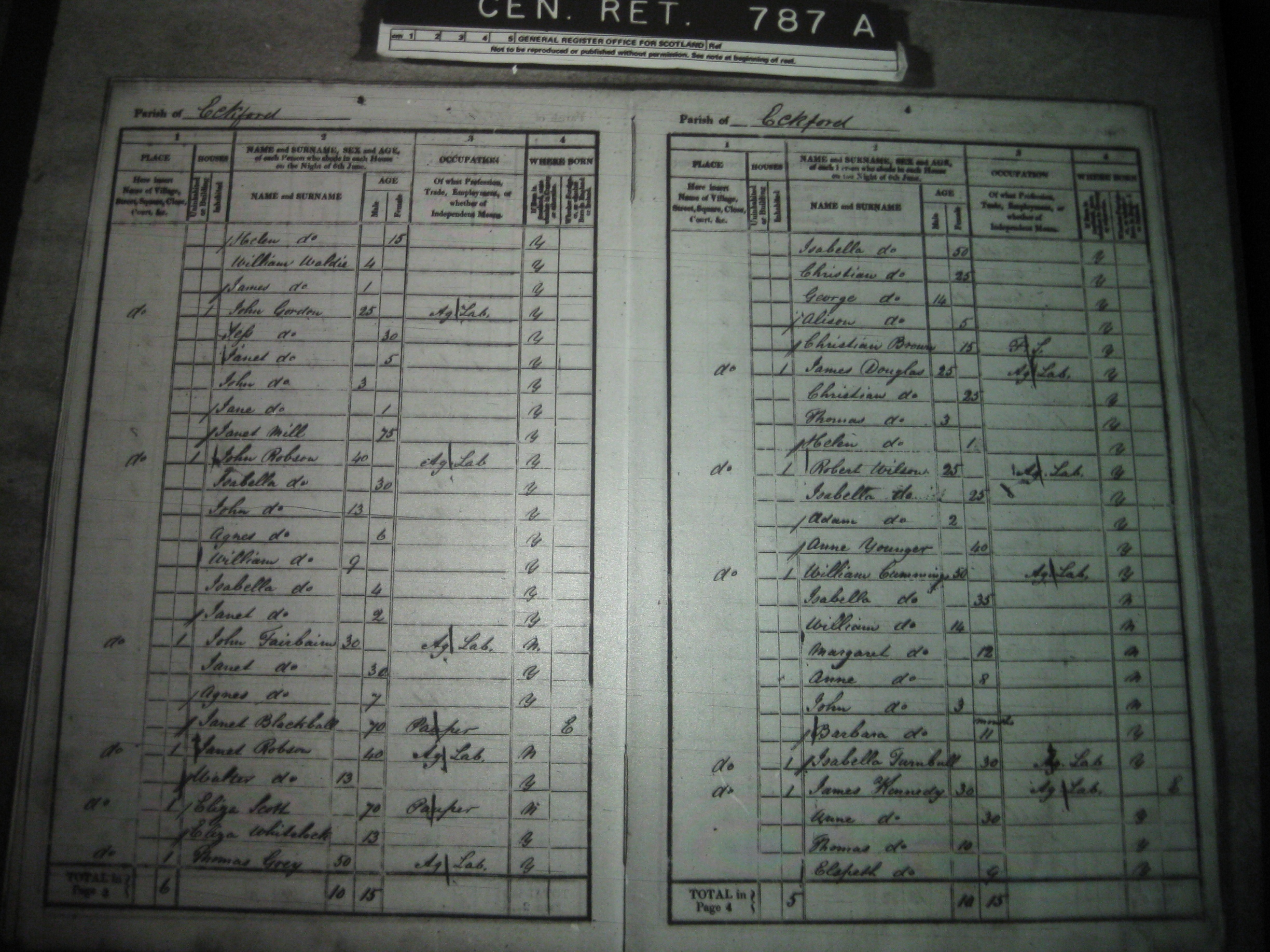 1. Census: 1841 Scotland, on 6 June 1841, in Eckford, Roxburghshire, Scottish Borders, Scotland. Parish Number: 787A ED: 2; Page: 3; Line: 1130 Address: Cessford John Fairbairn (30) Janet Fairbairn (30) Agnes Fairbairn (7) Janet Blackball (70).