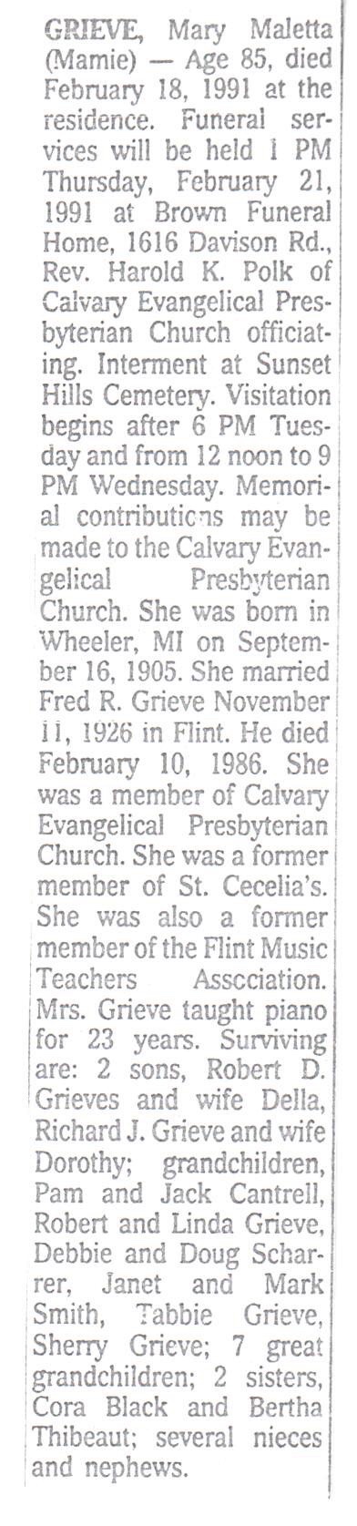 6. Her obituary was published on 19 February 1991 in Flint, Genesee, Michigan, United States. Maria married Fredrick Robert Alexander GRIEVE, son of Alexander F. GRIEVE and Jane A. MITCHELL, on 11 November 1926 in Flint, Genesee, Michigan, United States. (Fredrick Robert Alexander GRIEVE was born on 8 September 1900 in Cheboygan, Cheboygan, Michigan, United States,31 died on 10 February 1986 in Flint, Genesee, Michigan, United States and was buried in February 1986 in Flint, Genesee, Michigan, United States.) |