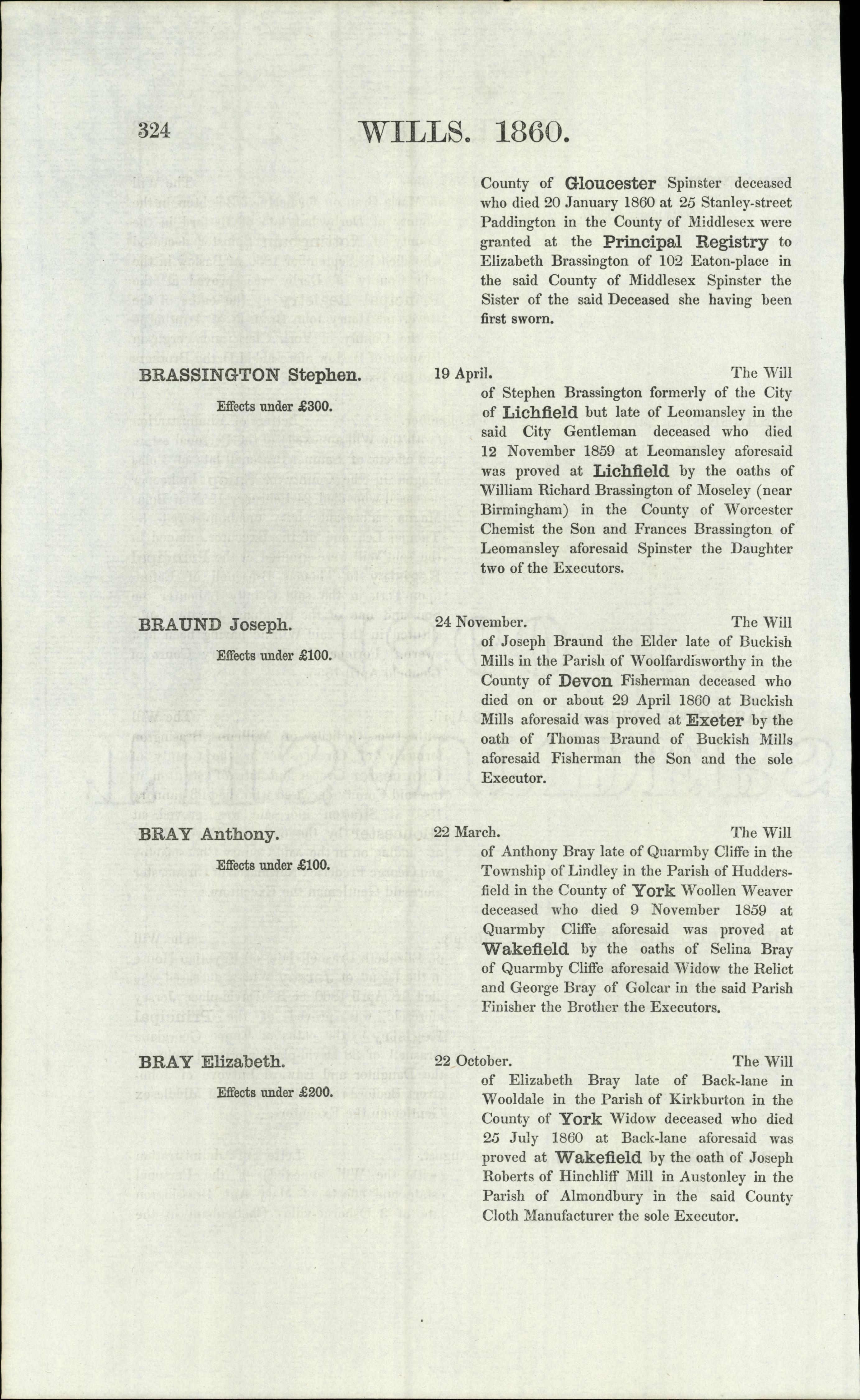 3. He signed a will Will of Joseph Braund on 29 November 1860 in Exeter, , Devonshire, England. Joseph married Susanna GLOVER, daughter of John GLOVER and Dorothy DEAN, on 14 June 1802 in Woolfardisworthy, , Devonshire, England.811 (Susanna GLOVER was born in 1777 in Parkham, , Devonshire, England, christened on 12 May 1780 in Parkham, , Devonshire, England, died on 10 November 1849 in Bideford, , Devonshire, England and was buried on 15 November 1849 in Woolfardisworthy, , Devonshire, England.) Marriage Notes: On page 43 of Marriage Banns of Woolfardisworthy. Joseph next married Elizabeth GLOVER. |