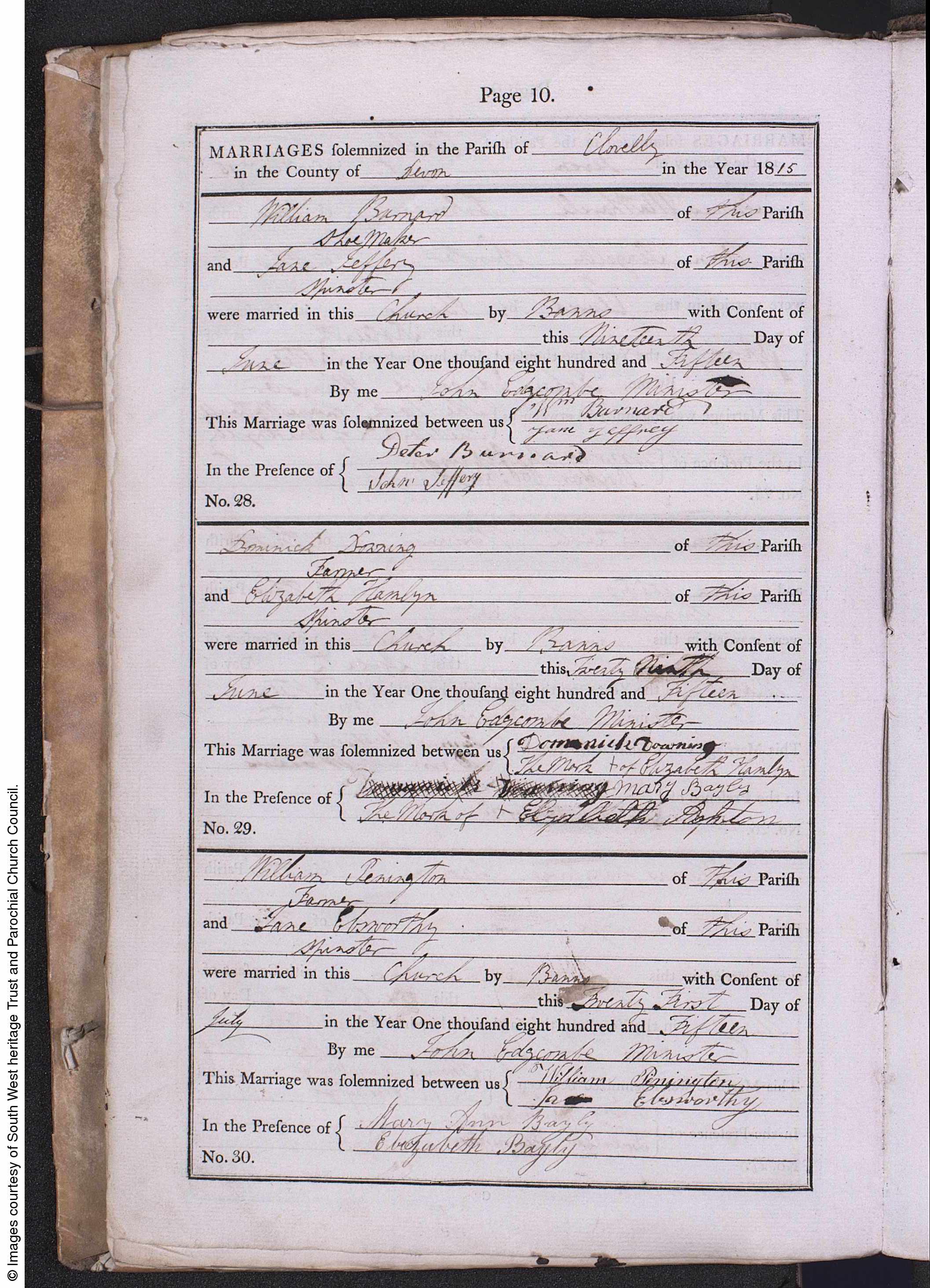 1. They had marriage banns published on 21 July 1815 in Clovelly, , Devonshire, England. 474 Marriage Notes: According to the 1841 British Census, William and Jane lived in Downland, Clovelly. William was 46 years of age and a farmer. Jane was also 46. Also listed in their residence were John Pennington (20), Oliver Pennington (14), Rosanna Pennington (12), Ann Pennington (8), Thomas Pennington (4), Servants, Grace Balash, and Henry Ebsworthy (50). There is no indication as to Henry's relationship to Jane. By the age, he could be a brother. |