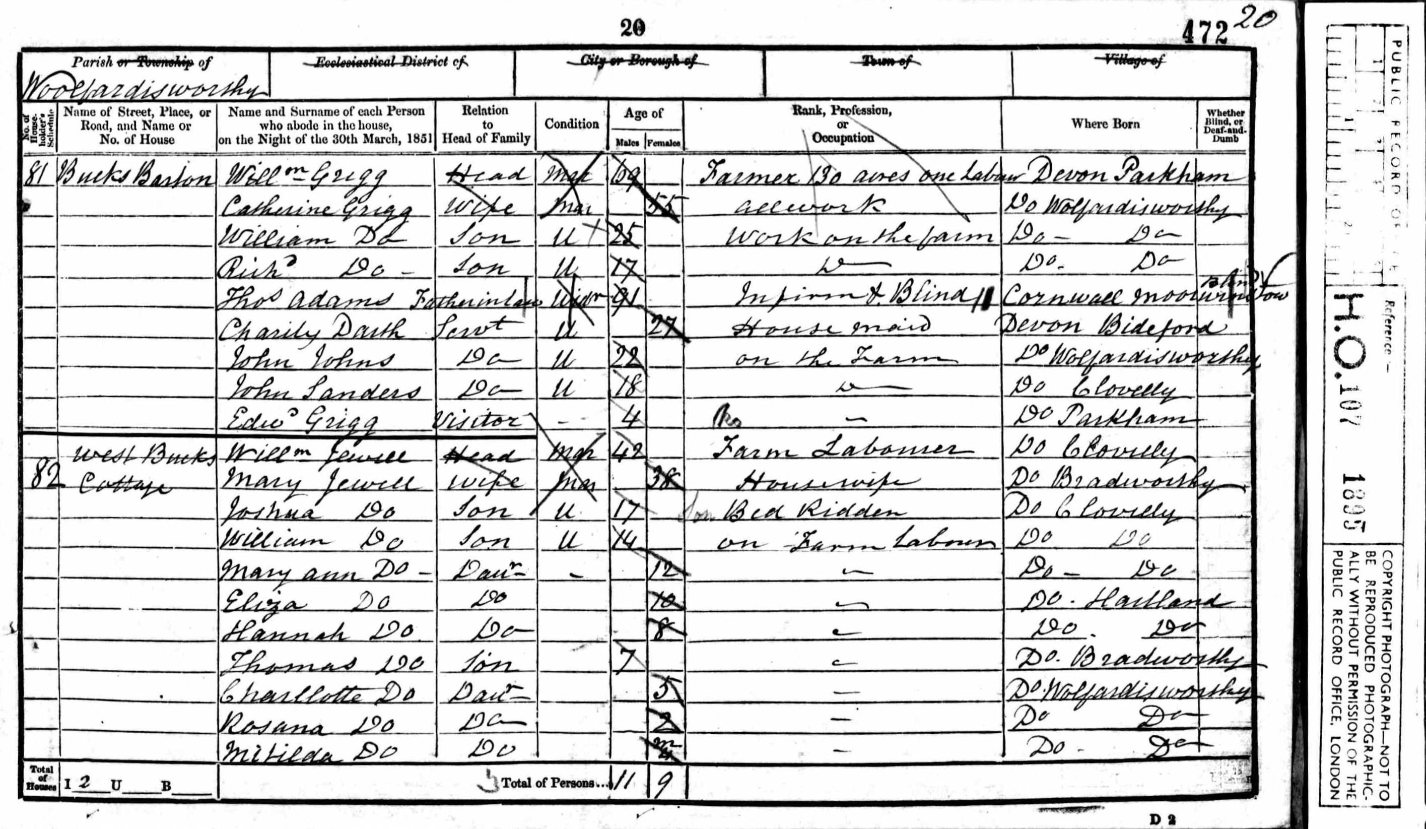 1. He appeared on the 1841 British census on 6 June 1841 in Woolfardisworthy, , Devonshire, England. This event was shared with Ann GRIGG (1823-After 1901), Catherine ADAMS (1796-1885), Enoch GRIGG (1827-1907), John GRIGG (1830-), Richard GRIGG (1833-), Seth GRIGG (1835-1920), Thomas ADAMS (1760-1855), and William GRIGG (Abt 1824-1885). 2. He resided at Buckish Barton on 6 June 1841 in Woolfardisworthy, , Devonshire, England. This event was shared with Ann GRIGG (1823-After 1901), Catherine ADAMS (1796-1885), Enoch GRIGG (1827-1907), John GRIGG (1830-), Richard GRIGG (1833-), Seth GRIGG (1835-1920), Thomas ADAMS (1760-1855), and William GRIGG (Abt 1824-1885).