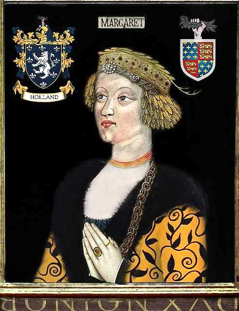Margaret de Holland, Countess of Somerset (1385-31 December 1439) was the daughter of Thomas Holland, 2nd Earl of Kent, who was the son of Joan "the Fair Maid of Kent" (granddaughter of Edward I of England, wife of Edward the Black Prince and mother of Richard II of England). Margaret's mother was Alice FitzAlan, daughter of Richard FitzAlan, 10th Earl of Arundel and Eleanor of Lancaster.