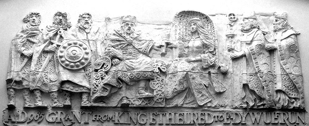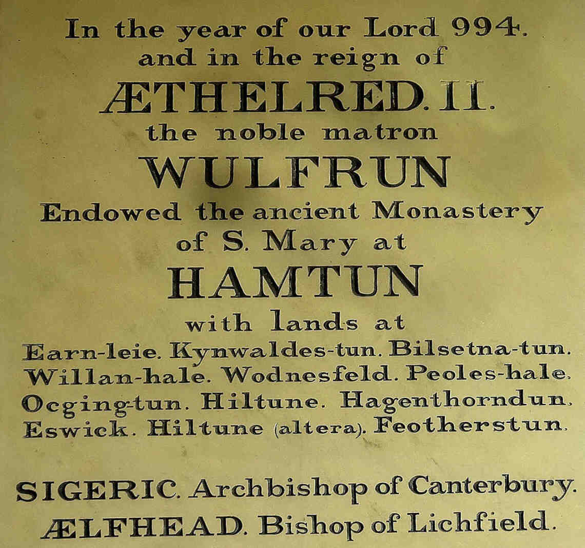 3. Endowment: Saint Mary at Hamtun, in 994, in Wolverhampton, , Staffordshire, England. The plaque in St Peter's Collegiate Church states: in the year of our Lord 994, and in the reign of Æthelred II, noble matron WULFRUN Endowed the ancient Monastry of S. Mary at HAMTUN With lands at Earn-ieie, Kynwaldes-tun, Bilsetna-tun, willan-hale, Wednesfeld, Peoles-hale, Oegintun, Hiltune, (altera), Feotherstun SIGERIC Arch Bishop of Cantebury ÆLFHEAD Bishop of Lichfield.