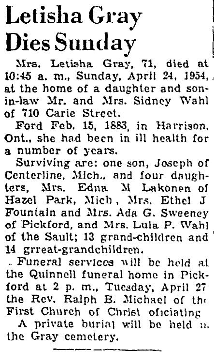 1. Her obituary was published in 1954. Letisha married Robert John GRAY, son of Thomas GRAY Sr. and Mary Jane KERR, in April 1892 in Stirlingville, Chippewa, Michigan, United States. (Robert John GRAY was born on 26 April 1868 in Rawdon, Matawinie, Quebec, Canada,454 died on 16 May 1917 in Stirlingville, Chippewa, Michigan, United States and was buried on 17 May 1917 in Stirlingville, Chippewa, Michigan, United States.). The cause of his death was Accidental explosion of dynamite caps. Noted events in their marriage were: 1. They published an intent to marry Democrat/Sault Ste. Marie News - Page 4 on 30 April 1892 in Sault Ste. Marie, Chippewa, Michigan, United States. |