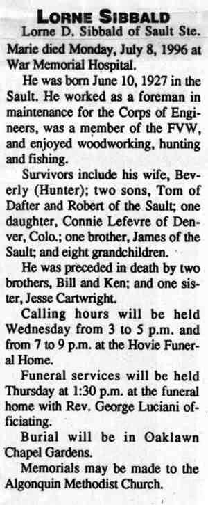 6. His obituary was published in the Soo Evening News on 10 July 1996 in Sault Ste. Marie, Chippewa, Michigan, United States.
