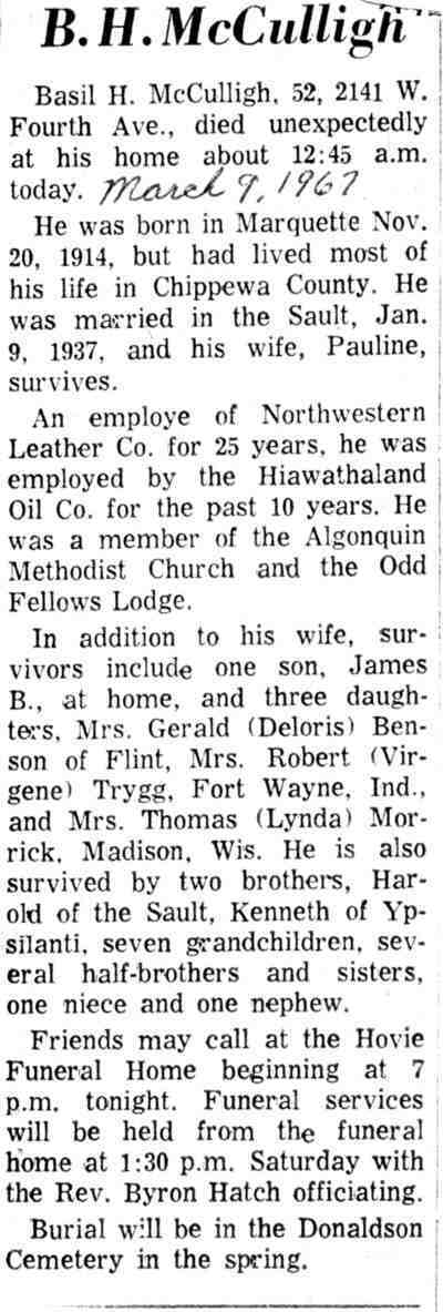 6. His obituary was published in the Soo Evening News on 9 March 1967 in Sault Ste. Marie, Chippewa, Michigan, United States.