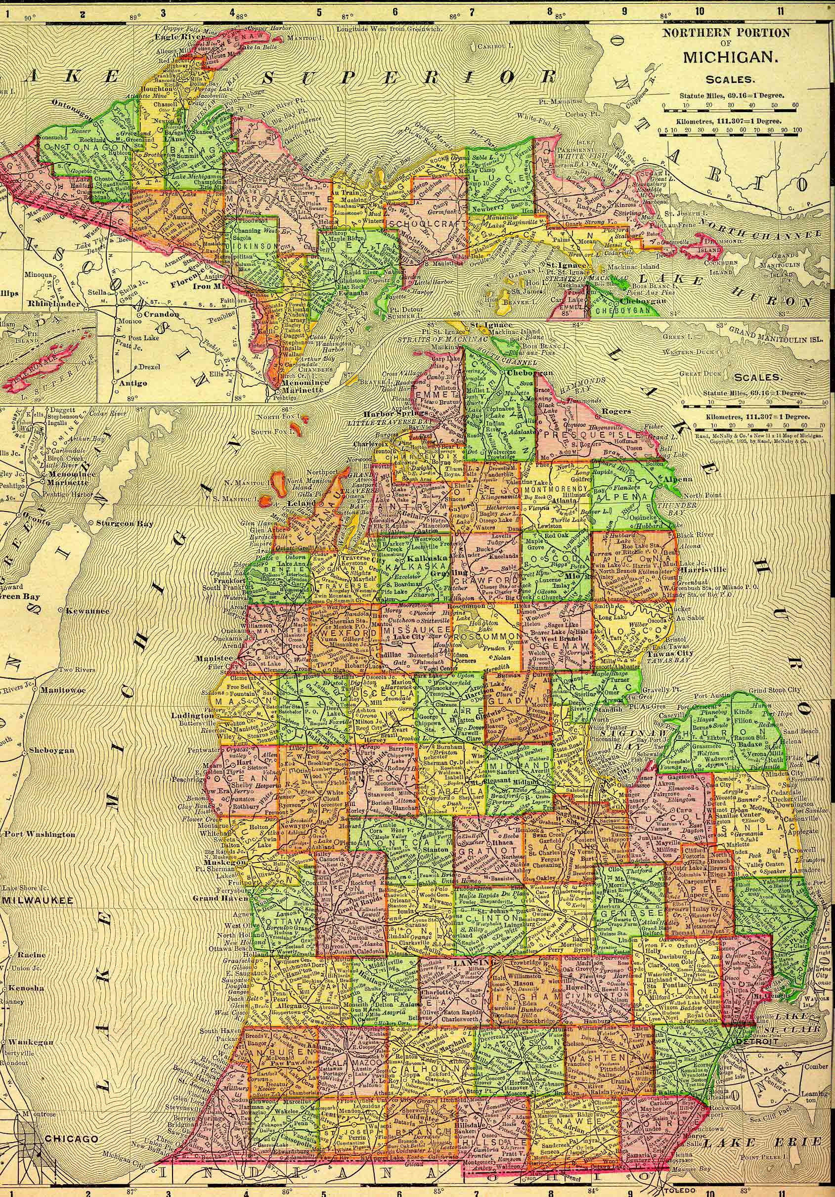 Image file   Map of Michigan - 1895 NOTE: This is a large file (1 MB) and may take a minute or more to load over a slow connection.
